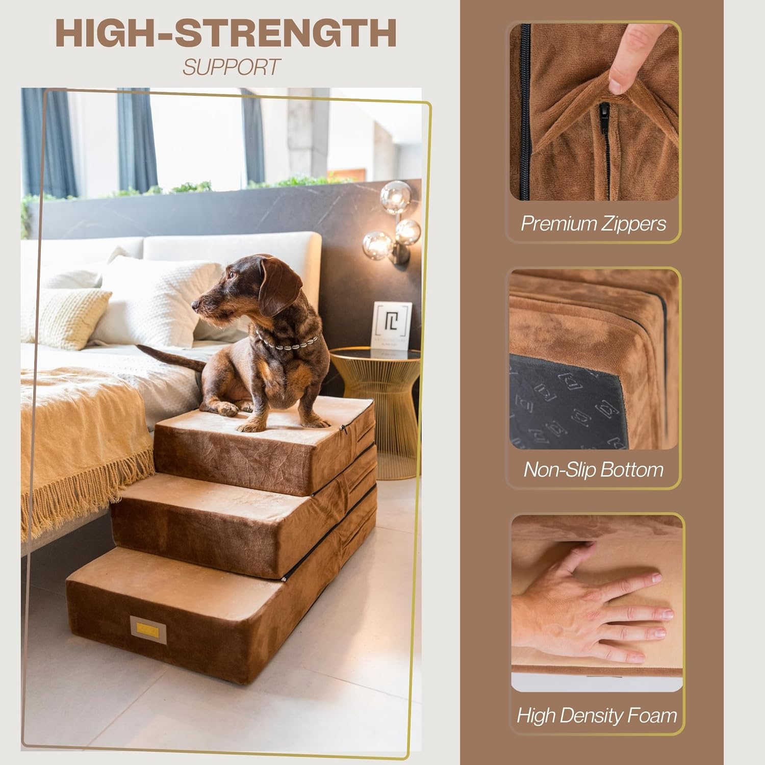 All-in-One Adjustable Dog Stairs – 5-Step Premium Pet Ramp for Small to Large Dogs – Sturdy, Non-Slip & Versatile for Beds, Sofas & More - Soft Cover, Modern Design (Brown)