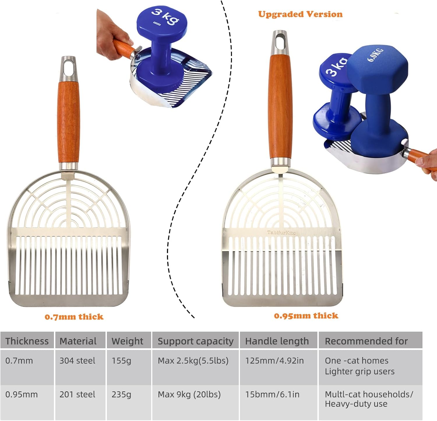 - [Upgraded to 0.95mm Thick ] This is a TabifurKitc custom-built heavy duty metal cat litter scoop, upgraded from 0.7mm to 0.95mm in thickness. Made from 201 stainless steel, this durable poop scooper supports up to 9kg (20 lbs) of clumping litter. Reinforced welds eliminate cracking or snapping, making it perfect for multi-cat households or anyone needing a litter box scooper that handles weight with ease.