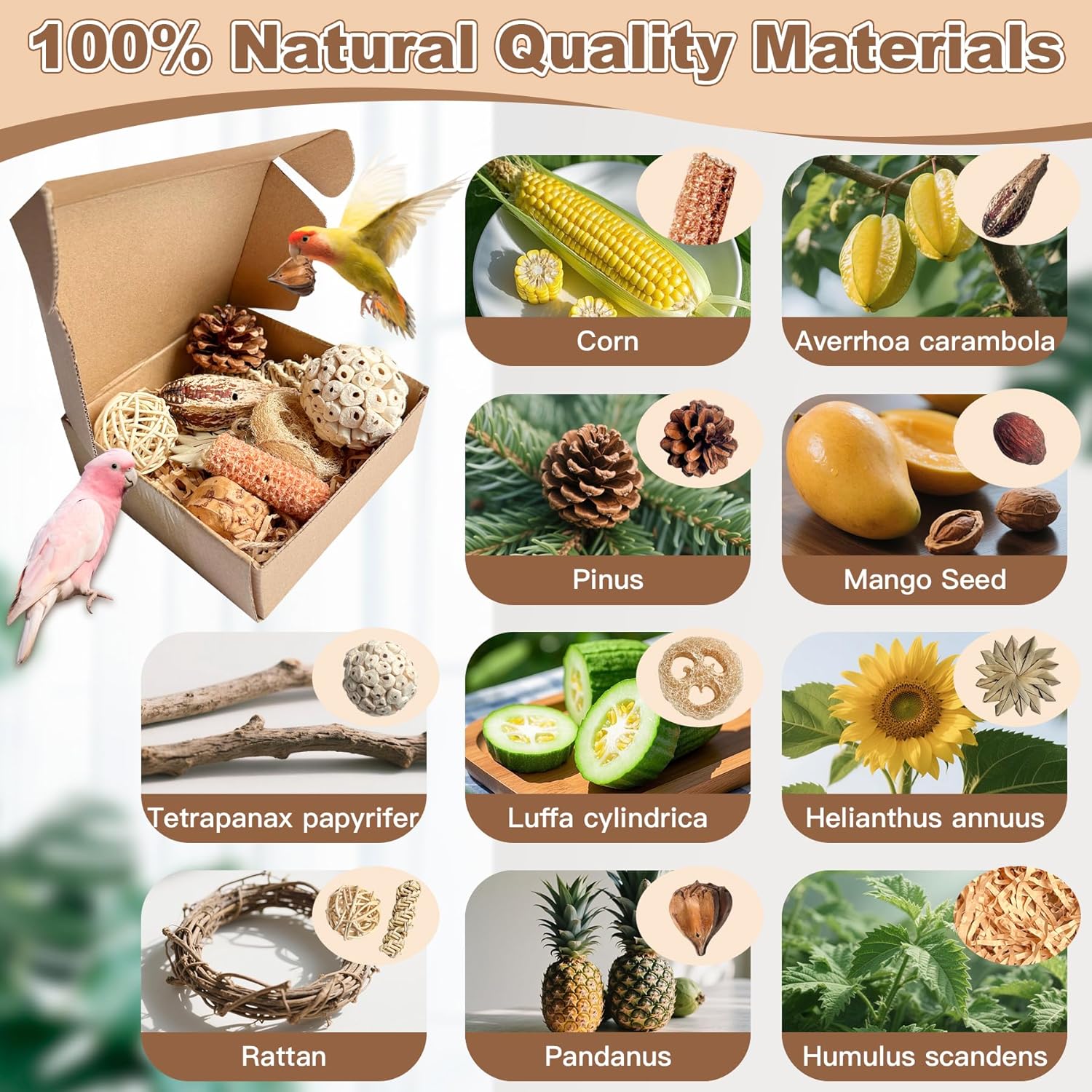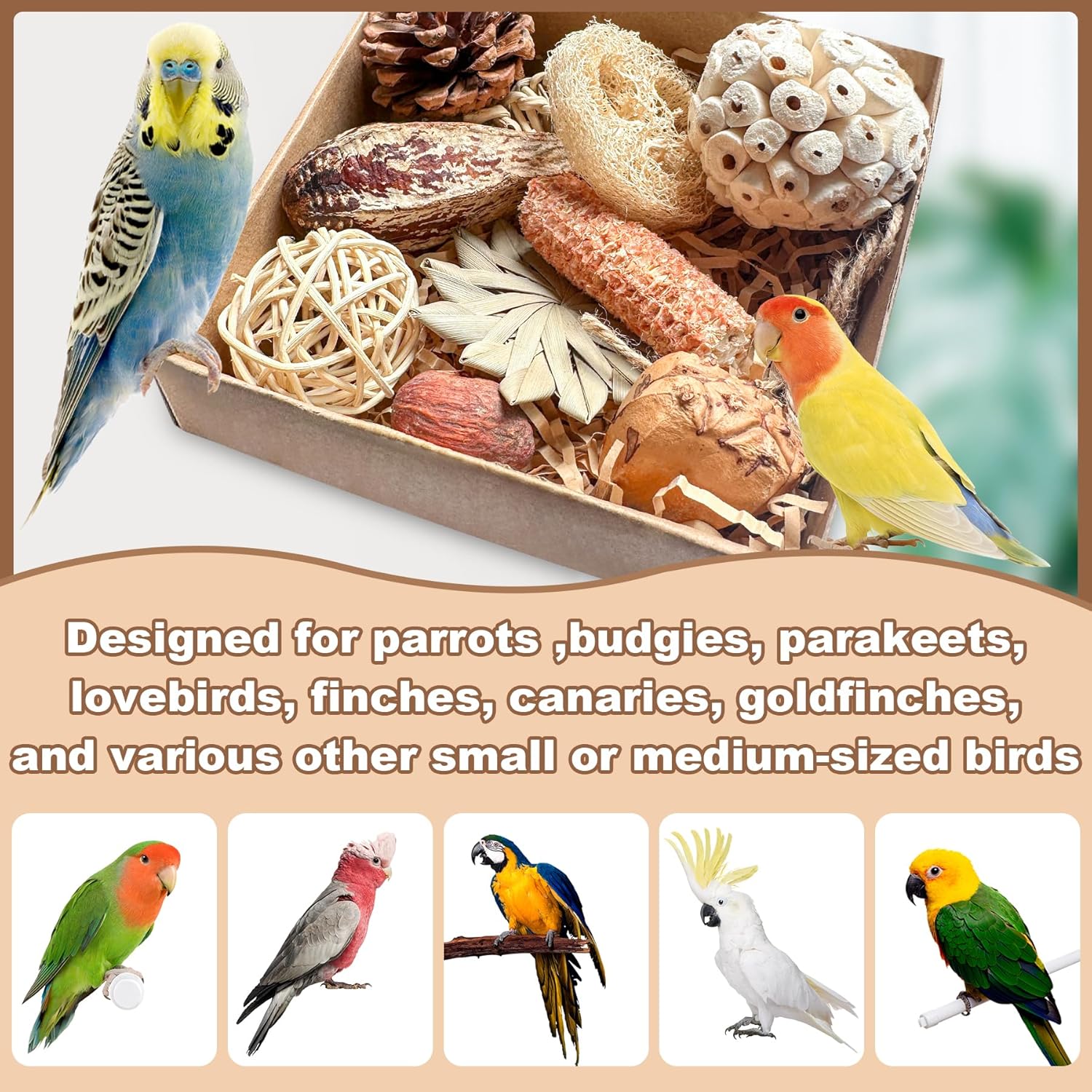 - π¦ PERFECT FOR EVERY BEAK PERSONALITYοΌ Shredders: Crunchy sunflower leaf discs & tearable grass paper Nibblers: Sweet mango wood & textured palm spirals Tossers: Bouncy sola balls & lightweight Ideal for conures, cockatiels, budgies, and moreβno bird left behind!