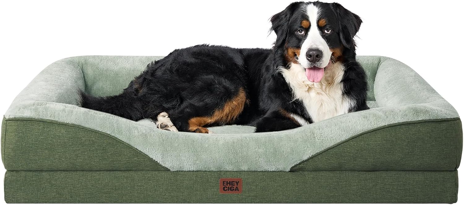 EHEYCIGA Memory Foam XXL Dog Bed for XLarge Sized, Extra Large Orthopedic Dog Sofa with Sides and Waterproof Liner, Washable Bolster Pet Couch with Removable Cover, 52x41x8 Inch, Green