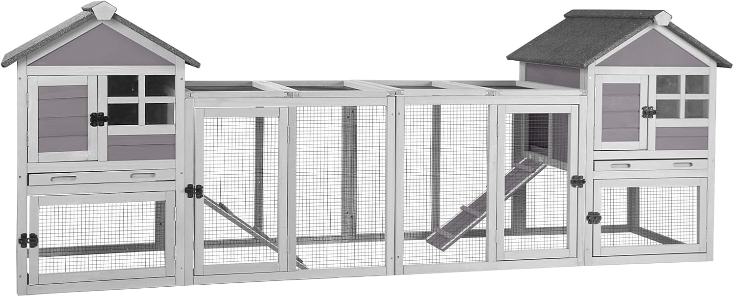 Aivituvin Rabbit Hutch Indoor Bunny Cage Outdoor with Run Chicken Coop Guinea Pig House with Waterproof Asphalt Roof,No Leakage Pull Out Tray (103.2" L x 25.2" W x 36.2" H, Grey-2 Sets)