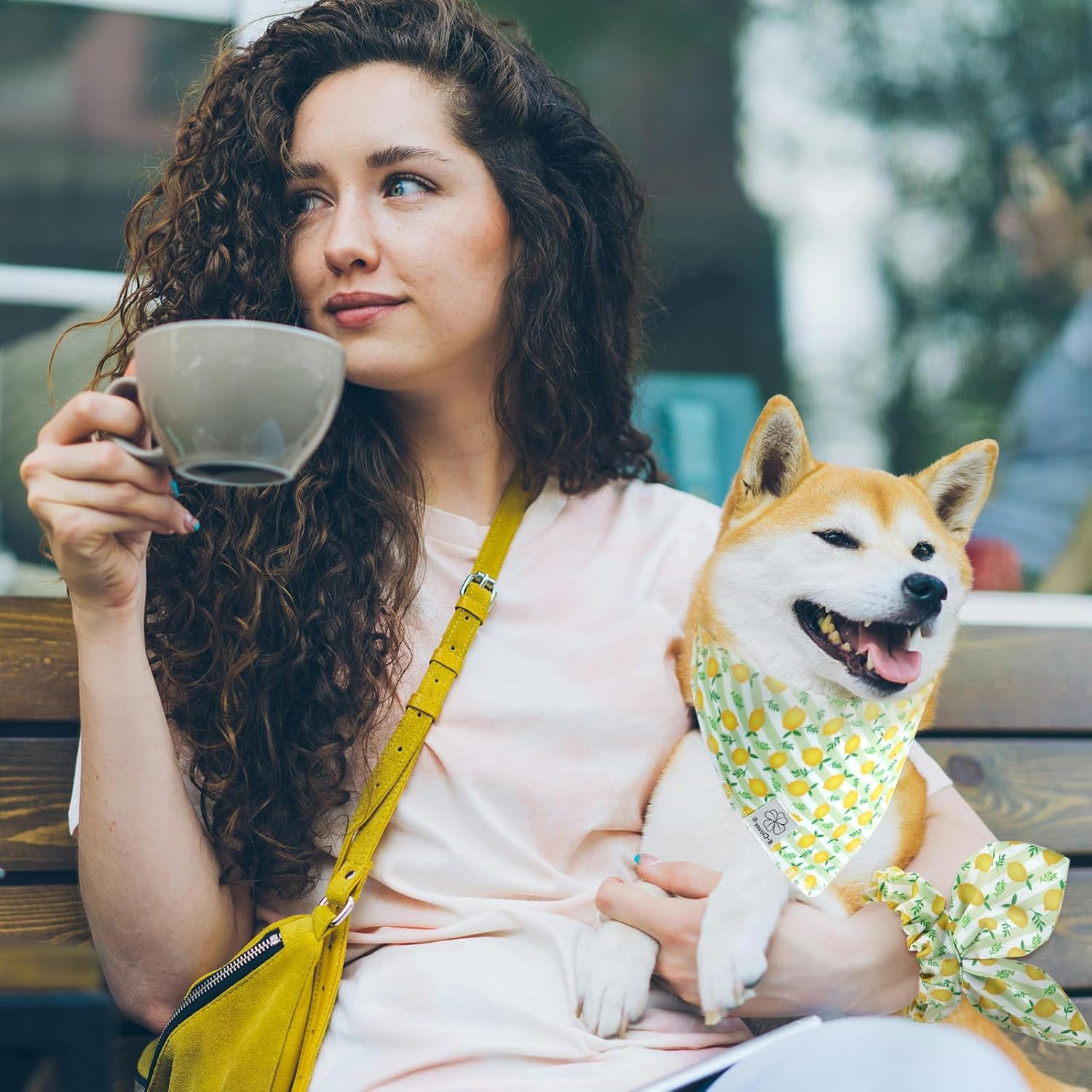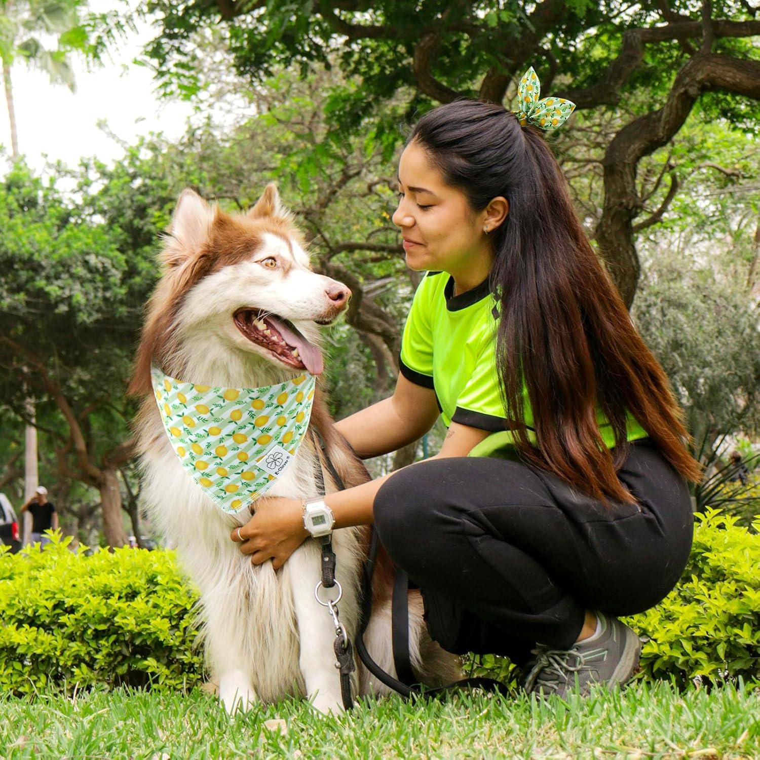 - Matching Bandana and Scrunchie Set: Itβs full of love when your pets is wearing the summer theme bandanas and you are wearing the bow scrunchies. When traveling, sleeping, taking photos or daily warking, adorable dog bandana and scrunchie is a pretty accessories. The the hair tie can be worn as a wrist accessory and hold your hair. Beautiful dog drool bibs and scrunchie with lemon pattern, itβs nice photo props.