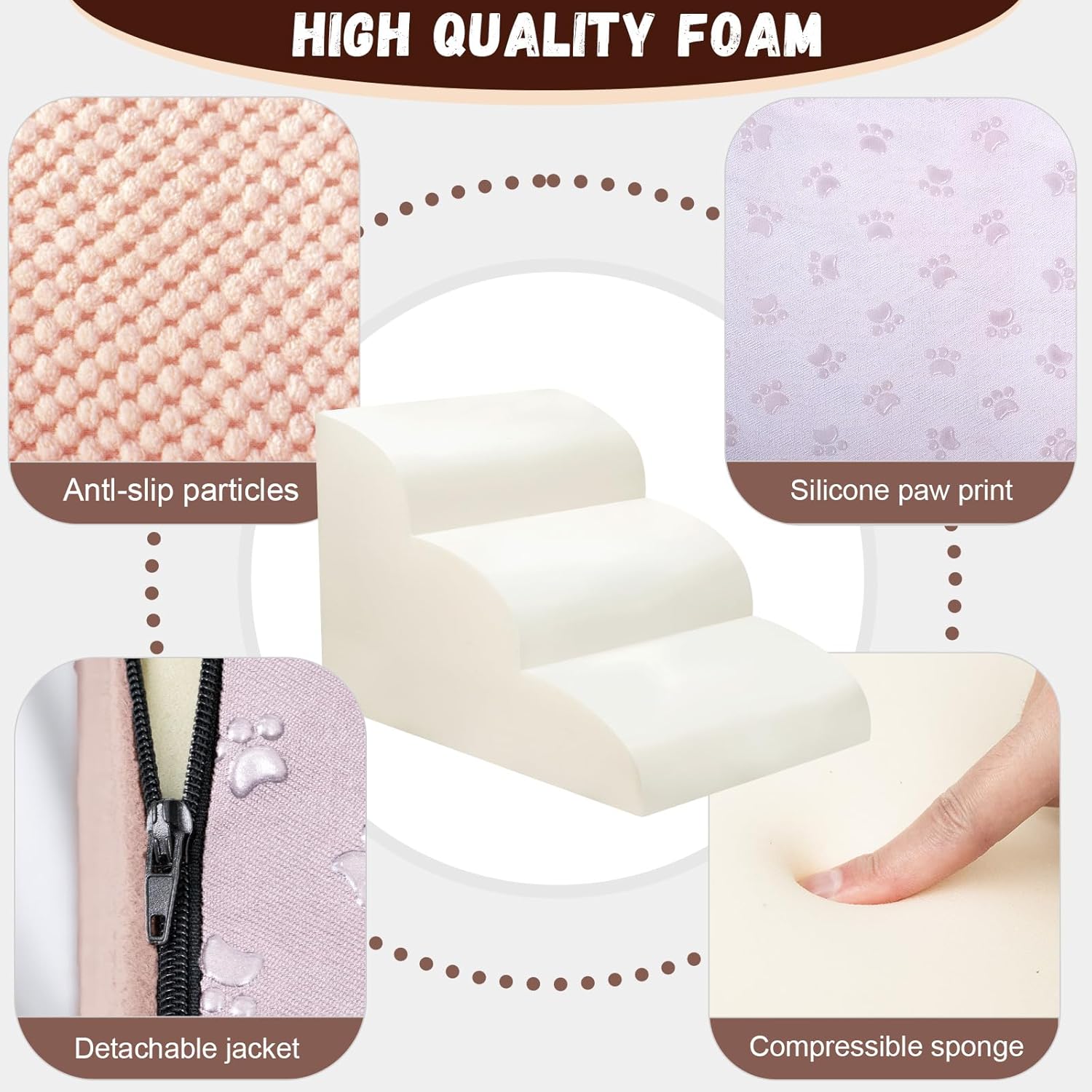 Dog Stairs for Small Dogs - High Density Foam Pet Steps, Extra Wide Dog Ramp with Non-Slip Bottom for High Beds, Couch and Sofa, Best for Dogs Injured, Older Doggy Cats,3 Steps, Pink