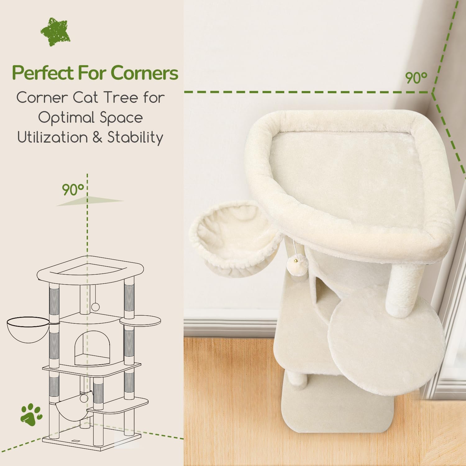 Globlazer Corner Cat Tree Tower with Scratching Post for Indoor Cats, 51in Plush Multi-Level Cat Tower with Large Hammock, Fan-Shaped Padded Perch, Spacious Cat Condo, Hanging Basket, C51, Light Beige