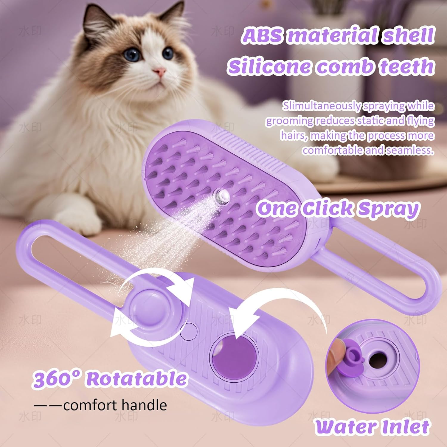 4 in 1 Cat & Dog Steam Brush Kit with 2 Comb Heads - Rechargeable Grooming Brush for Long/Short Hair Shedding, Anti-Static Steam Spray & Foldable Handle, Pet Spa Cleaning Tool (Purple)