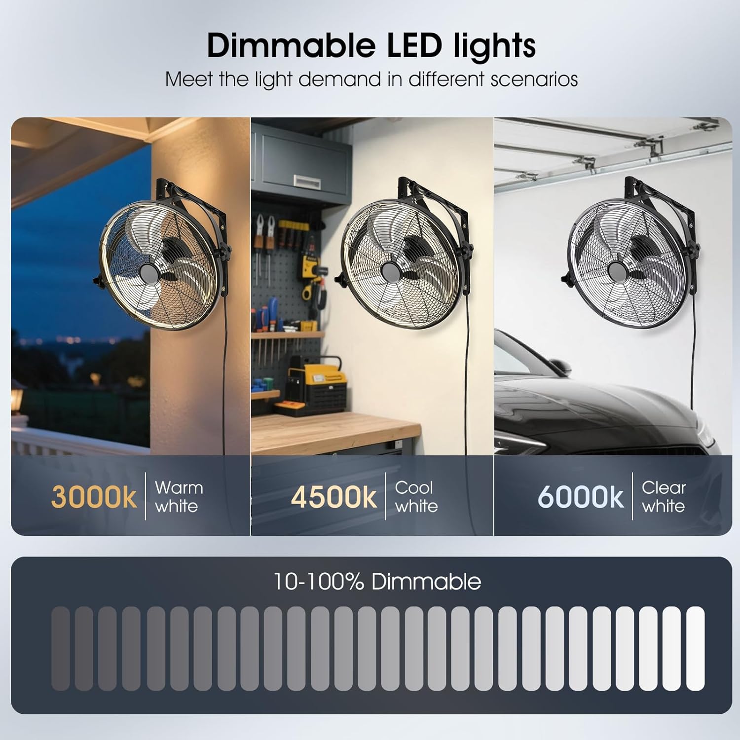 - γWall Mount FanγOur wall fan with full metal casing,safer.The fan combines cooling and lighting in one,you can adjust wind speed,light,timing,reversible and many other functions,comes with a 7.5ft power cord,giving you the flexibility to place the outdoor fan in covered patios,garages,warehouses and factories.