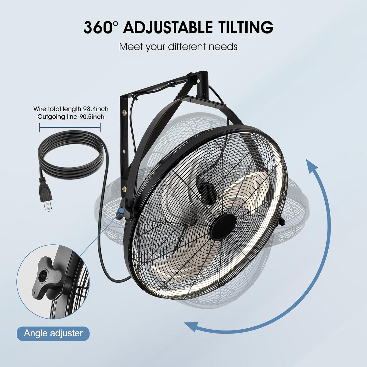 - γWall Mount FanγOur wall fan with full metal casing,safer.The fan combines cooling and lighting in one,you can adjust wind speed,light,timing,reversible and many other functions,comes with a 7.5ft power cord,giving you the flexibility to place the outdoor fan in covered patios,garages,warehouses and factories.