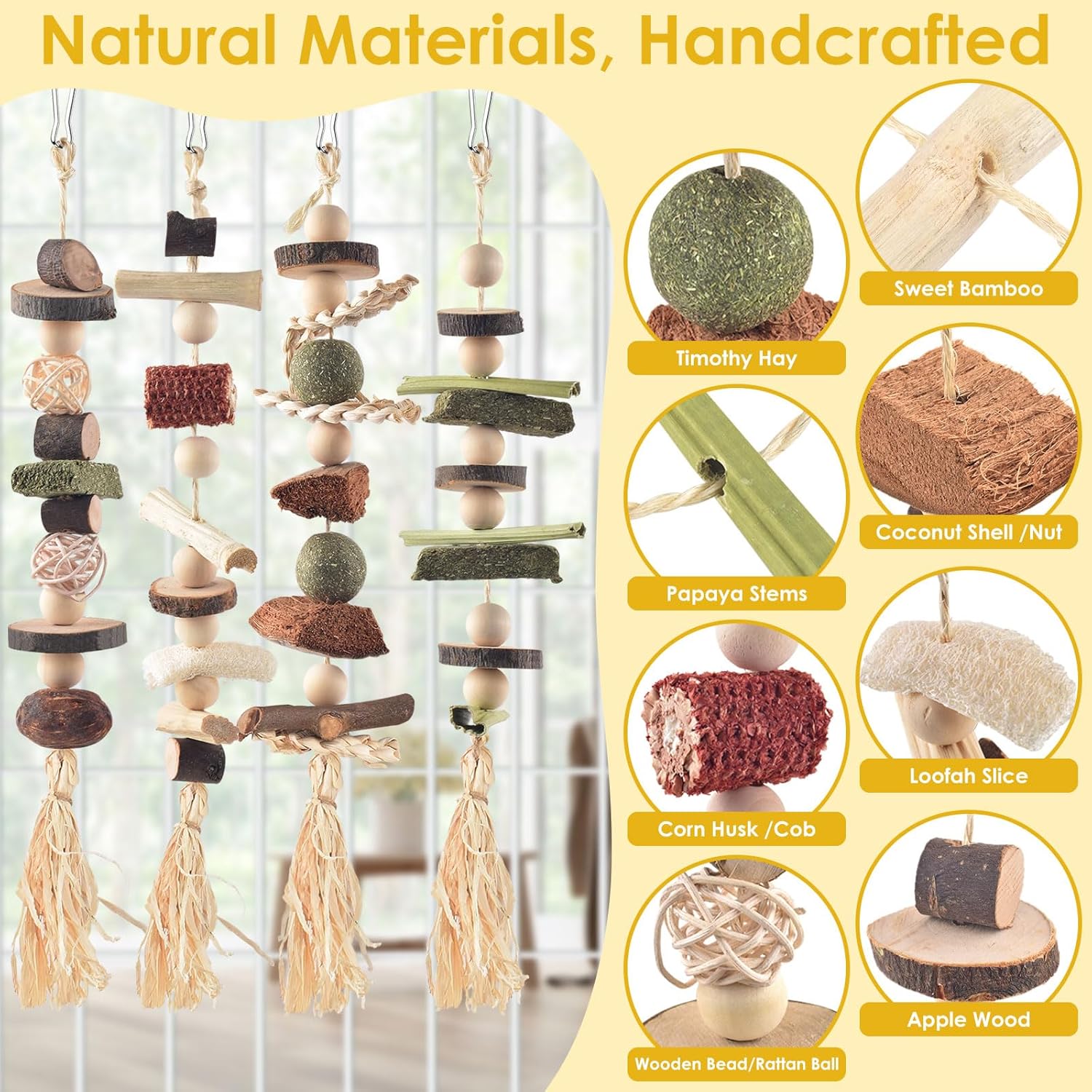 - Wide Uses: These rabbit chew and treats can be hung in cages with hooks and are suitable for rabbits, bunnies, hamsters, guinea pigs, squirrels, chinchillas, and even parrots, providing more fun and entertainment for your pets