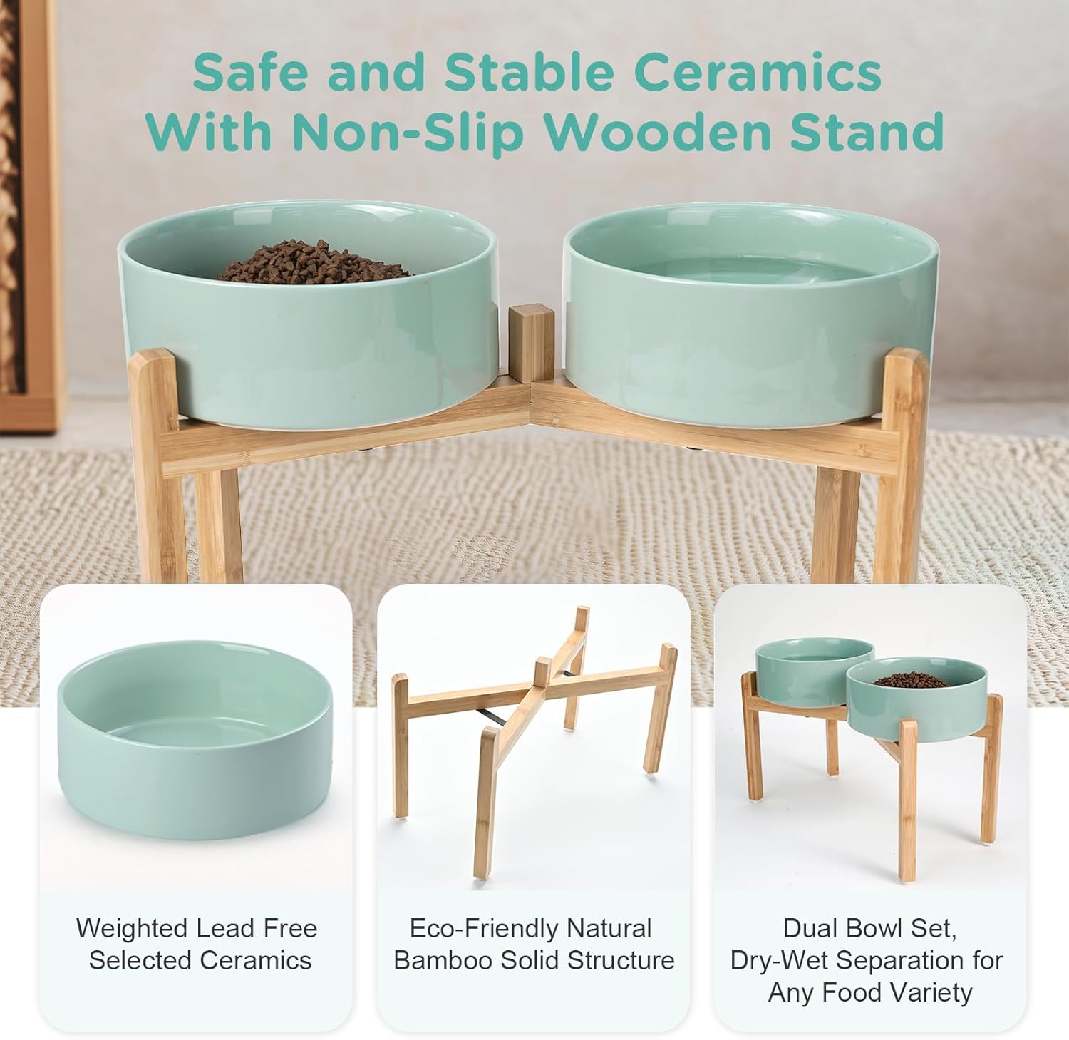 - Stable, Tip‑Resistant Design – A solid bamboo frame with Chew‑Resistant Heavyweight Ceramic, wide stance, and slip‑proof silicone pads join forces to create raised dog bowls that STAY IN PLACE on tile, wood, or laminate. Fewer spills mean cleaner floors and no accidental gouges or scratches or noisy