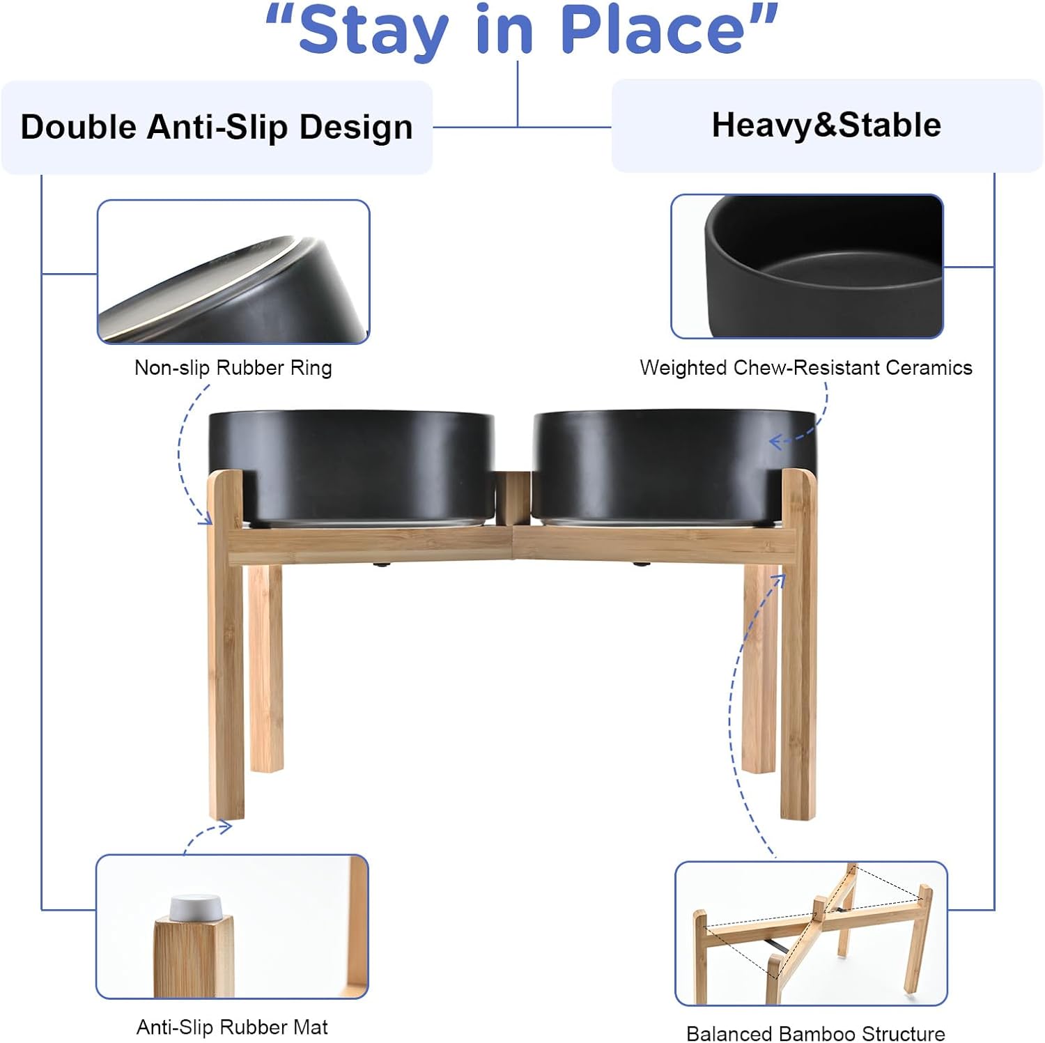 - Stable, Tip‑Resistant Design – A solid bamboo frame with Chew‑Resistant Heavyweight Ceramic, wide stance, and slip‑proof silicone pads join forces to create raised dog bowls that STAY IN PLACE on tile, wood, or laminate. Fewer spills mean cleaner floors and no accidental gouges or scratches or noisy