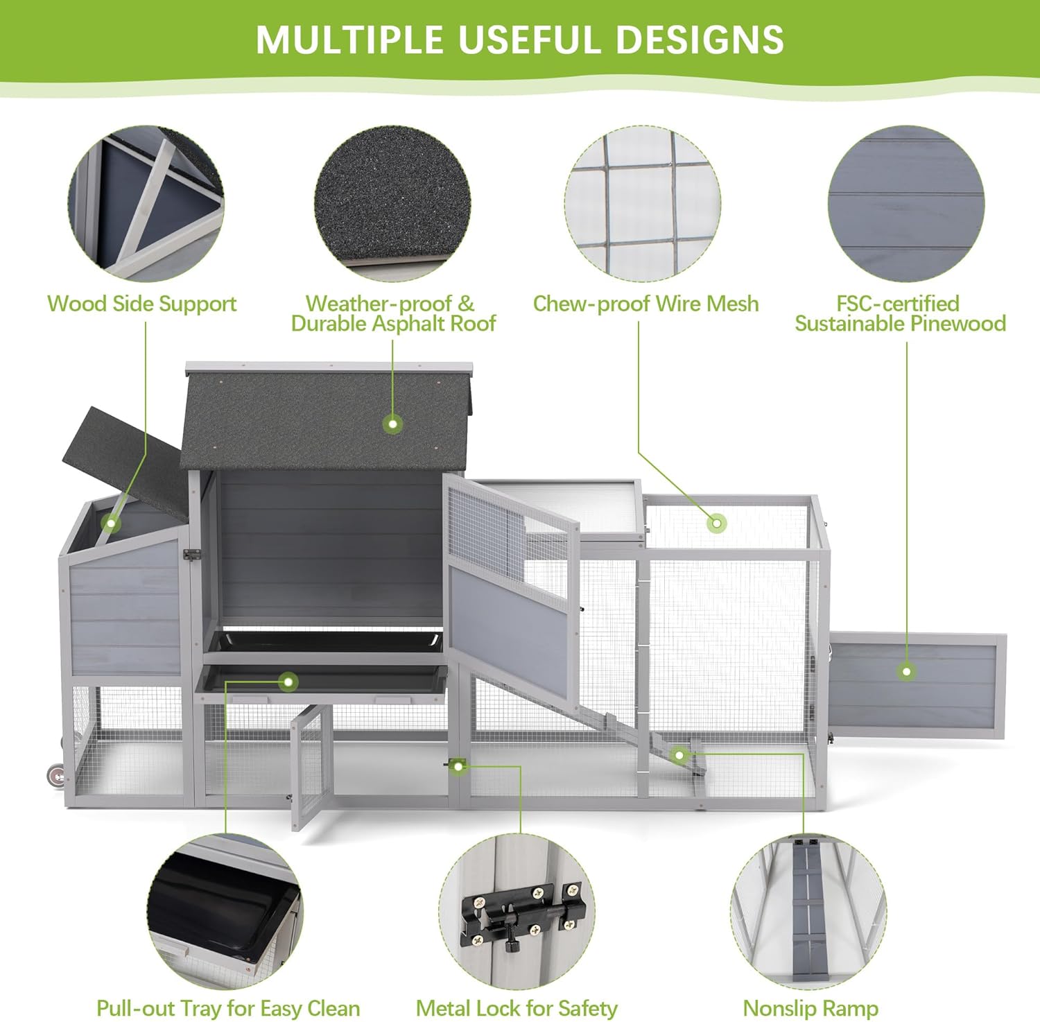 COZIWOW 82" Large Wooden Chicken Coop, Outdoor Rabbit Hutch with Wheels, Sunshine Board, Asphalt Roof, Ramp, Openable Top, Door, Window, Pull-Out Tray, Indoor Bunny Cage (Gray with Pattern)