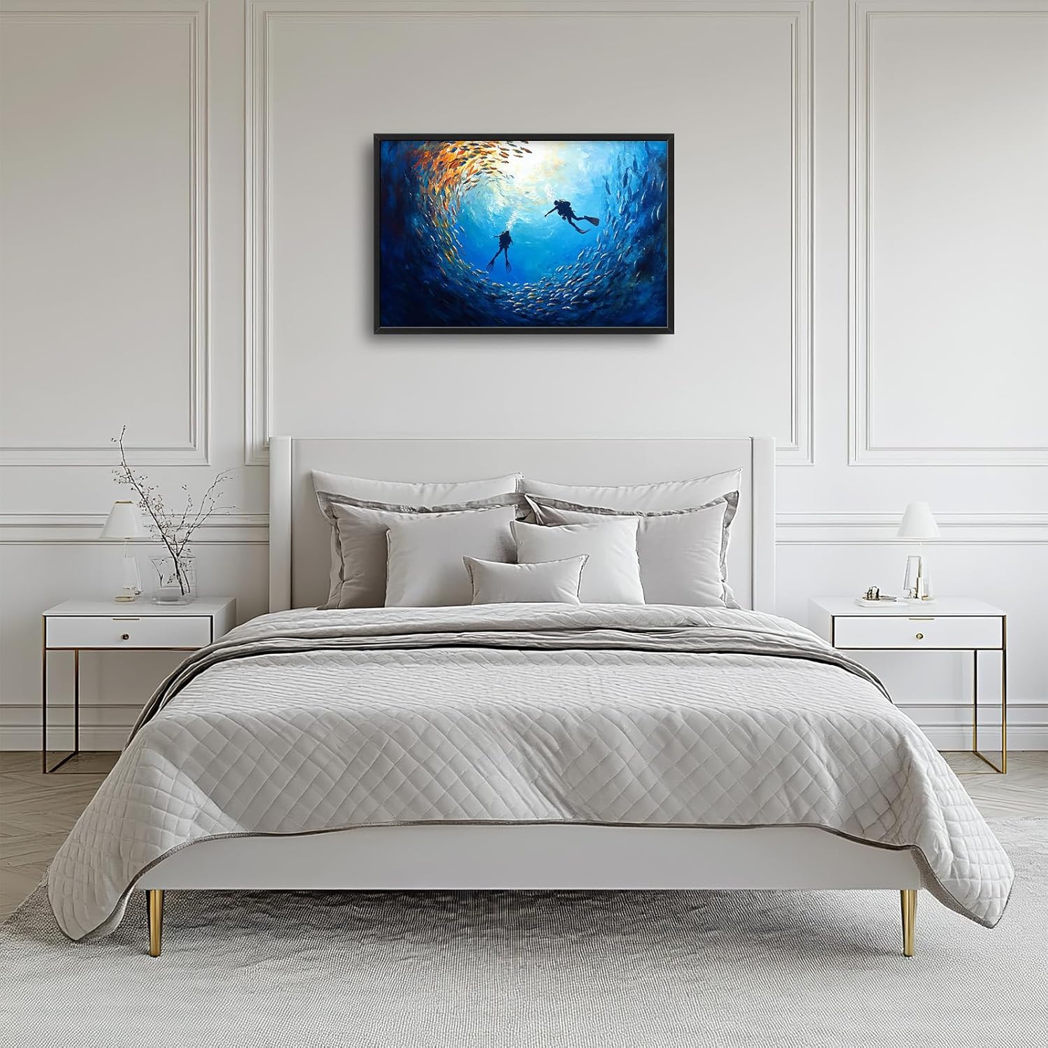 Large Ocean Diving Wall Art for Living Room, Framed Oversized Fish Wall Decor Underwater Marine Life Canvas Painting Modern Artwork for Living Room Bathroom Bedroom Office Dining Room 36"x24"