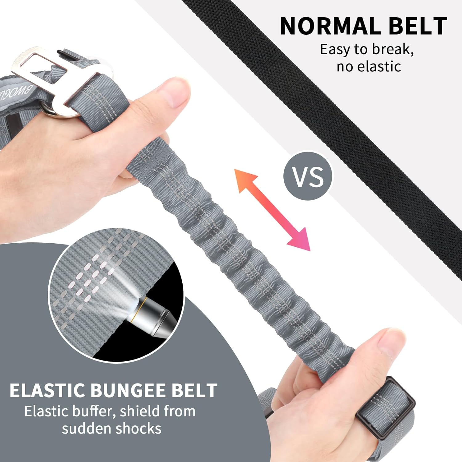 - Well Made & Durability: Extra durable rip-stop nylon, a powerful elastic bungee cord and high quality metal hardware, strong and durable. The buckle design of dog car leash, can be quickly locked and released, making pet safety belt more practical. The elastic bungee helps dog prevent jerking with sudden movement