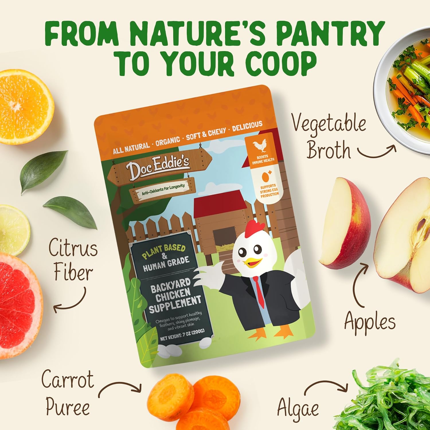 - Nature's Own Superfood - Doc Eddie’s Chicken Supplement is a human-grade, plant-based treat packed with essential omegas 3 & 6 that transform your backyard flock into vibrant egg-laying hens with glossy feathers and exceptional health without artificial additives.