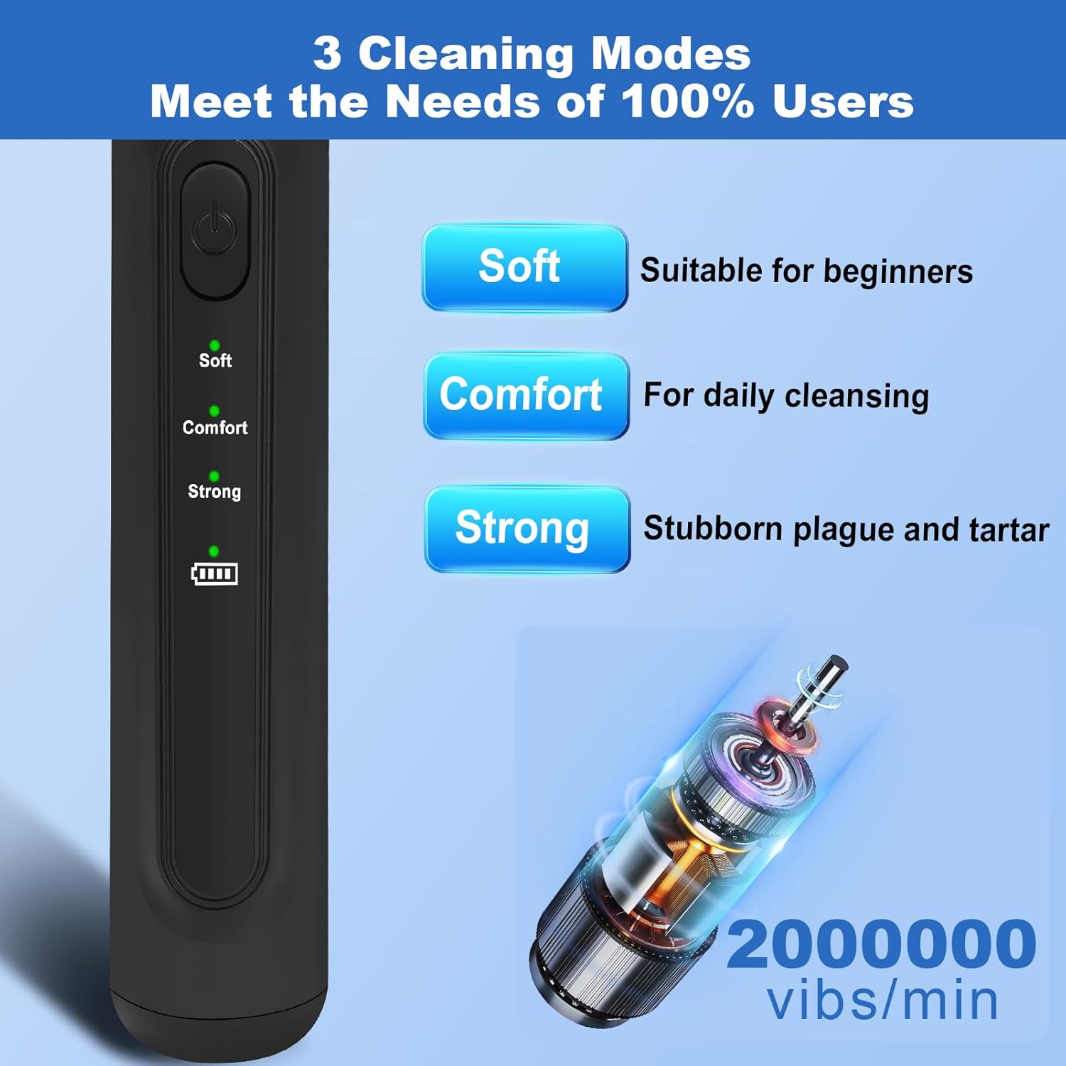 - Easy to Use & Complete Kit : Three modes (soft, comfort, strong) suit needsβstart with soft for first use. A button press reduces buildup. It includes an ultrasonic cleaner, 2 heads, a dental probe, and a wrench for home care