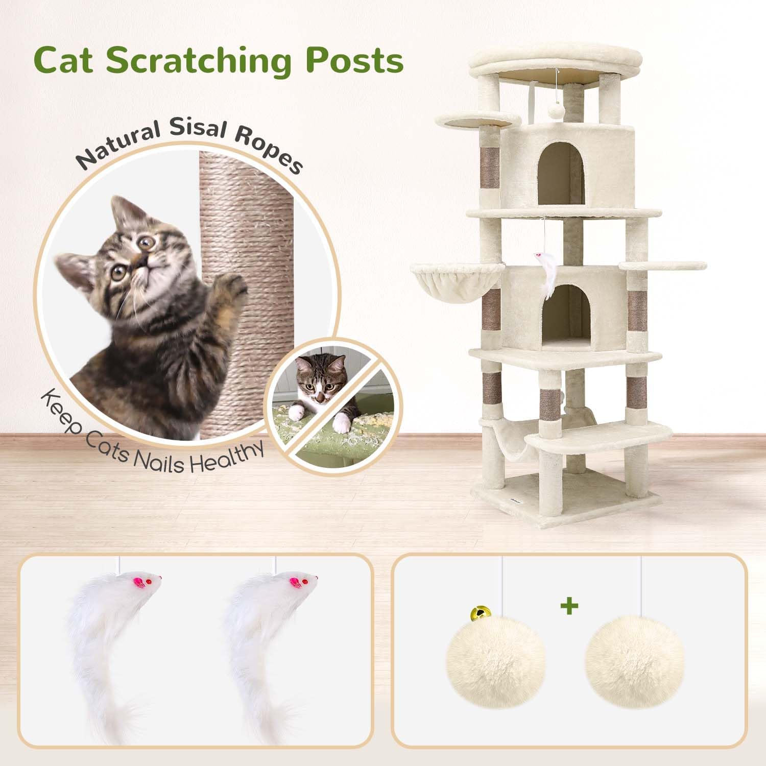 Globlazer Corner Cat Tree Tower for Large Cat, 66inch Tall Large Cat Tree Condo for Multiple Indoor Cats with 6 Scratching Posts, 2 Spacious Cat Condos, Soft Hammock, Hanging Basket, C66, Light Beige
