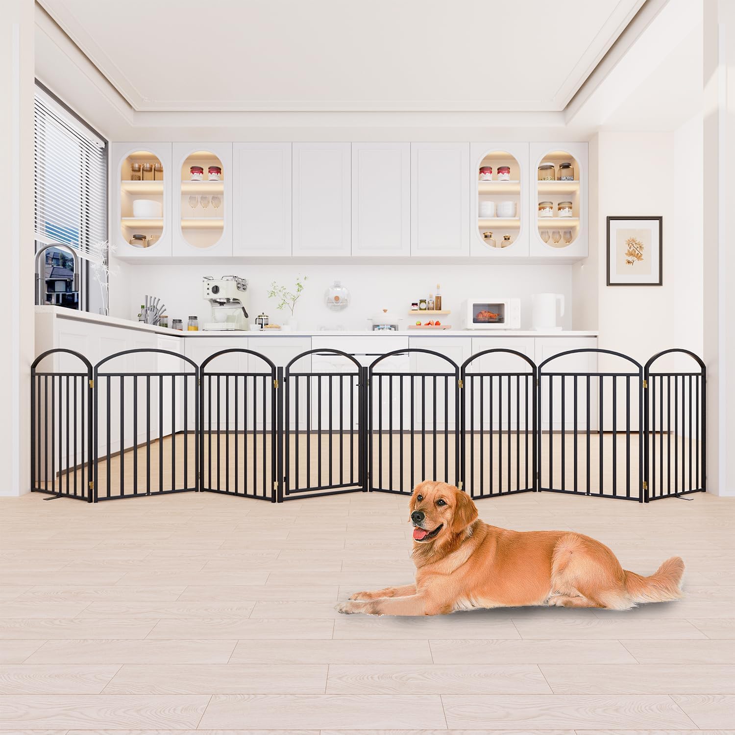 8 Panles Full Matel Freestanding Dog Gates with Door, 192"Extra Wide 32"Tall Free Standing Dog Pet Gate for Indoor & Outdoor. Foldable Pet Fences for Doorways, House, Stairs, Porch, Deck, Yard
