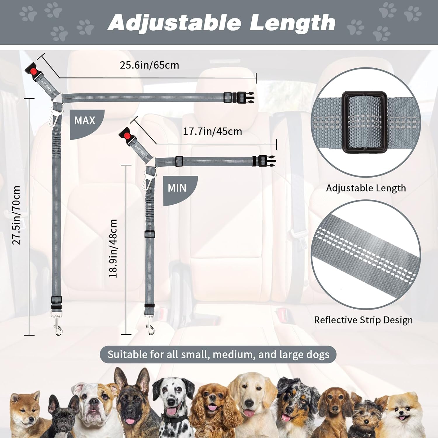 - Adjustable Length: Dogs come in different sizes and weights. Our car harness restraint tether can be adjusted between 18.9-27.5 inches and can be stretched to 31.5 inches for the maximum length. The circle is adjustable from 17.7 inches to 25.6 inches. It's very convenient to fasten the dog leash with a lockable quick release buckle switch on your car headrest, also can make sure it will not loosen when your dog pulling on the strap to keep your pet in a safety state