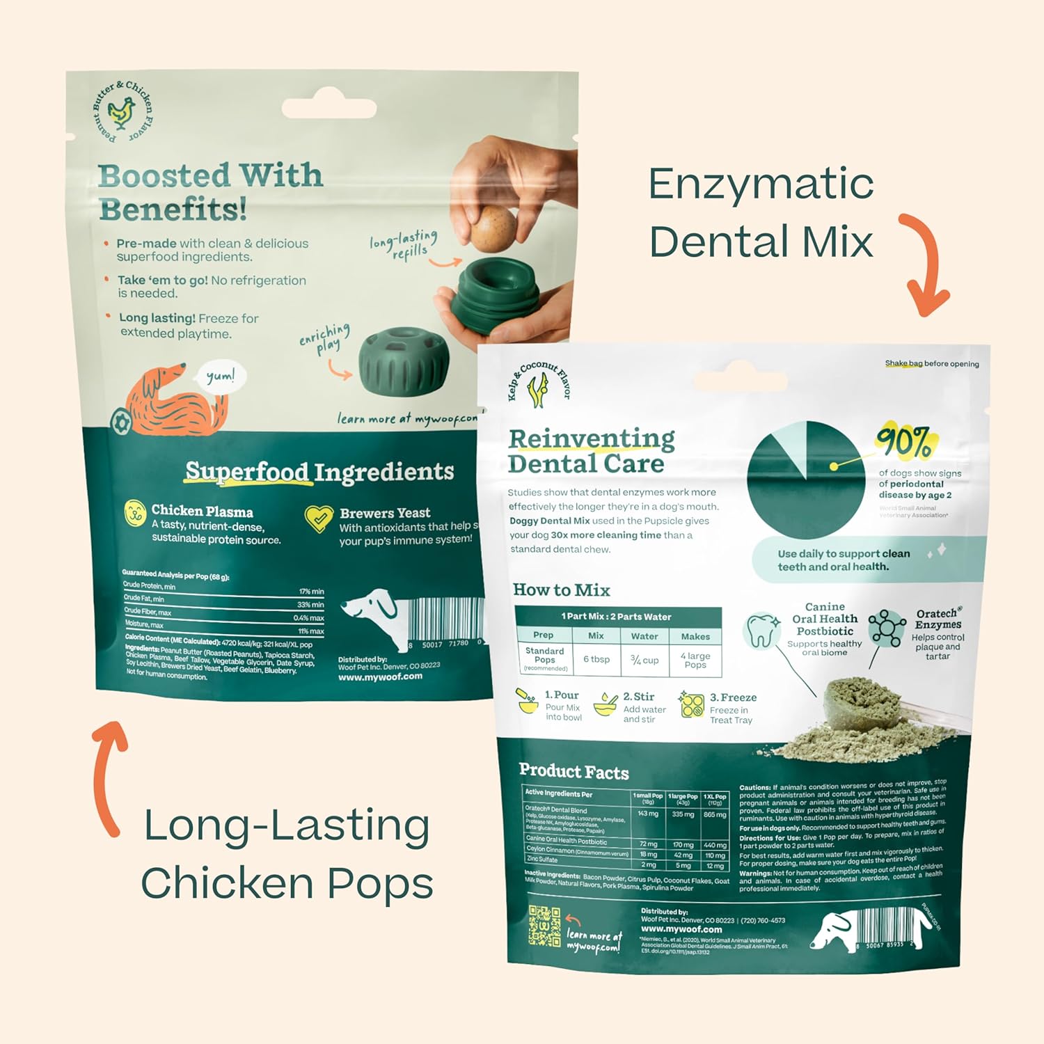 WOOF Dental Kit- Includes Pupsicle Dog Toy, Treat Tray, Shaker Bottle, Chicken Pupsicle Pops, and Dog Teeth Cleaning Powder - Supports Oral Health for Dogs - XL