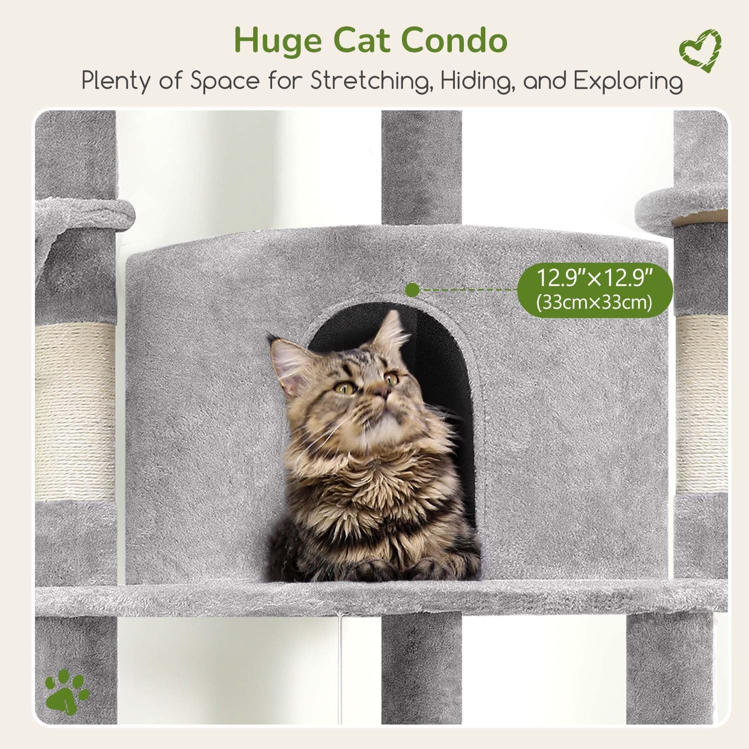 - Natural Sisal Posts: This sturdy cat tree condo tower is fitted with 7 robust scratching posts wrapped in natural sisal, ideal for meeting your indoor catβs scratching needs and protecting your furniture from wear. These durable posts support healthy paw maintenance and encourage natural climbing and exploration behaviors