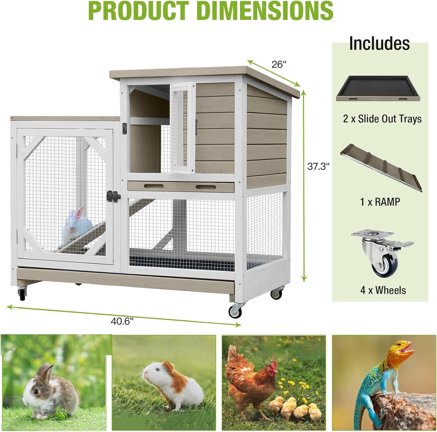 GUTINNEEN 2-Story Rabbit Hutch with Chew-Proof Ramp & Pull-Out Trays - Indoor/Outdoor 39.3" Wooden Rabbit Cage on Wheels for Rabbits, Guinea Pigs (Light Brown)