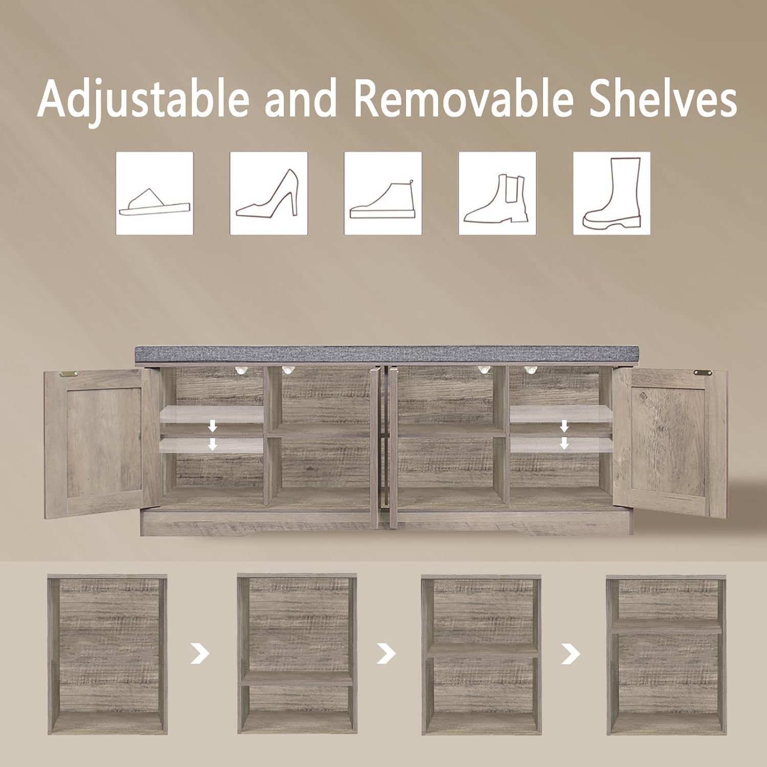 - 【Flexible for Multiple Needs】4 middle compartments are fixed for sneakers, high heels and sandals. The side compartments have 3 adjustable heights for slippers, tall boots or storage boxes. Use as an entryway bench, window seat or bedside bench to store blankets, books and toys in the living room and bedroom