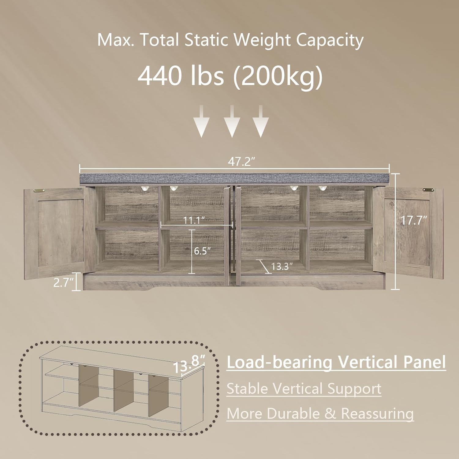 - 【Stable & Long-lasting】The shoe rack bench is made of high quality particle board. Durable compartments design provides extra vertical support, enabling it to bear a load up to 440lbs (200kg). Its removable padded design can help you remove and clean cover easily. Dimension: 47.2”L x 13.8”W x 17.7”H