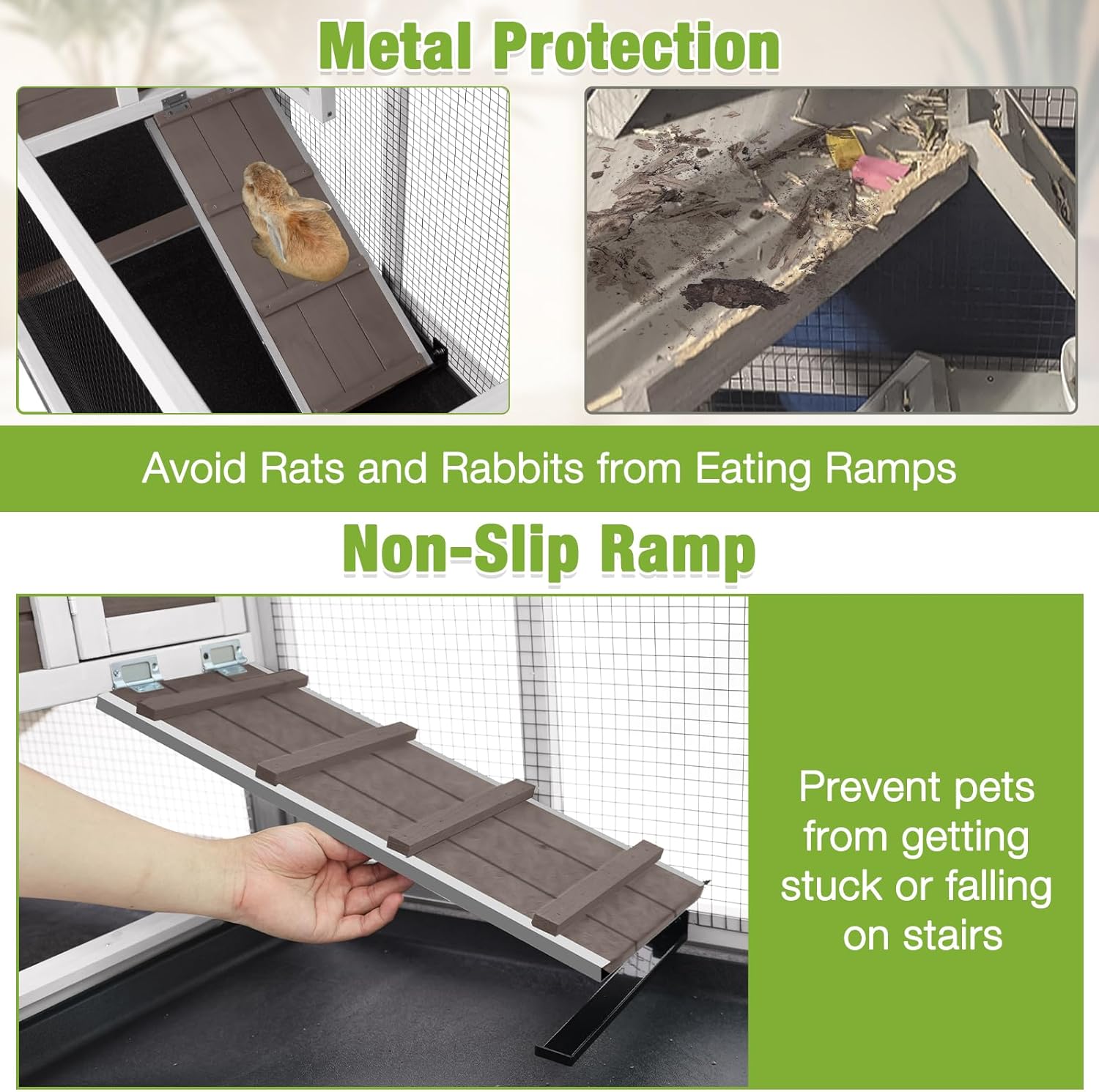 - Chew-Resistant Ramp Design: Our rabbit hutch's ramp has metal-edged corners to discourage chewing by rabbits and other small pets, enhancing the hutchβs long-term durability.This sturdy design protects against wear and tear, ensuring lasting use.