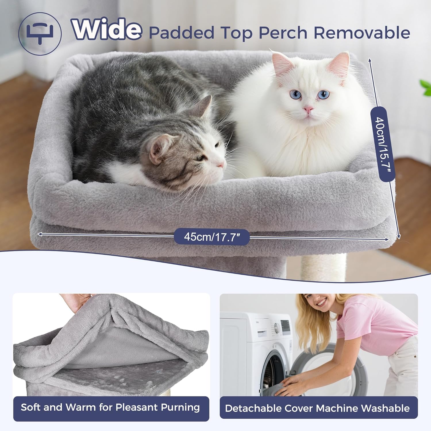 - Spacious Comfort and Easy Maintain: Our cat tree bed measuring a generous size at 16.5" x 16.5", is perfect for accommodating your big-boned kitty or even two medium-sized cats who love to snuggle up together. The plush padded cushion provides a cozy support for your cats to rest their furry heads, ensuring maximum comfort during their naps. The removable design help it easy to take off and makes cleaning a breeze.