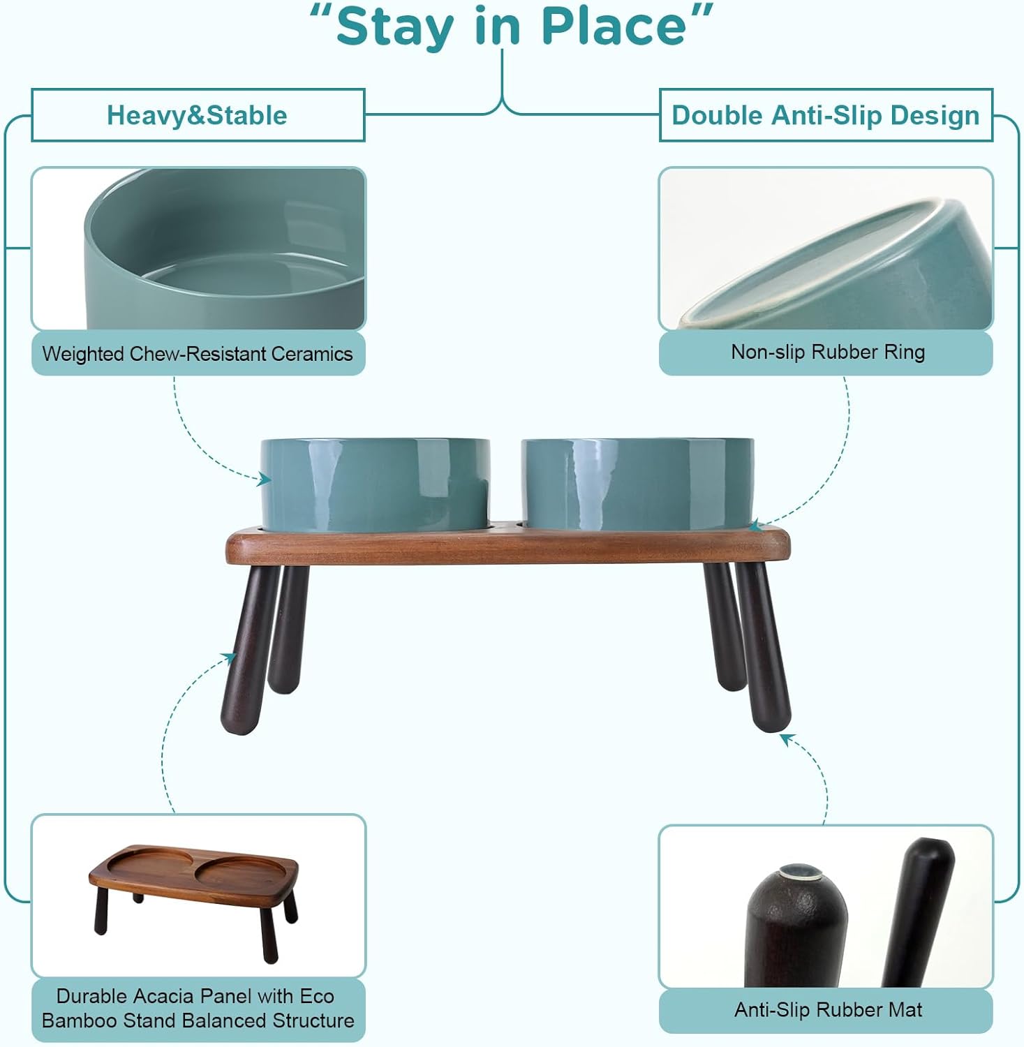 - Stable, TipβResistant Design β A solid acacia wooden panel eco bamboo legs stand with ChewβResistant Heavyweight Ceramic, wide stance, and slipβproof silicone pads join forces to create raised dog bowls that STAY IN PLACE on tile, wood, or laminate. Fewer spills mean cleaner floors and no accidental gouges or scratches or noisy