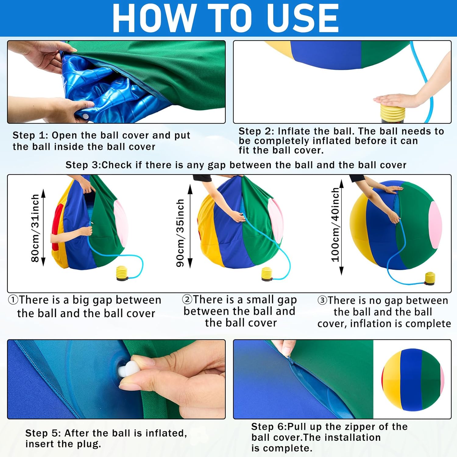 - Please Refer to Third Picture for the Inflation Installation: first, put the horse ball into the ball cover, open the air plug, and start to inflate; When inflated to 31 inches, there is a large gap between the horse ball and the ball cover; When inflated to 35 inches, there is still some gap between the horse ball and the ball cover; When inflated to 40 inches, the horse ball and the ball cover fit completely, inflation is complete, plug in the air plug, and finally zip up