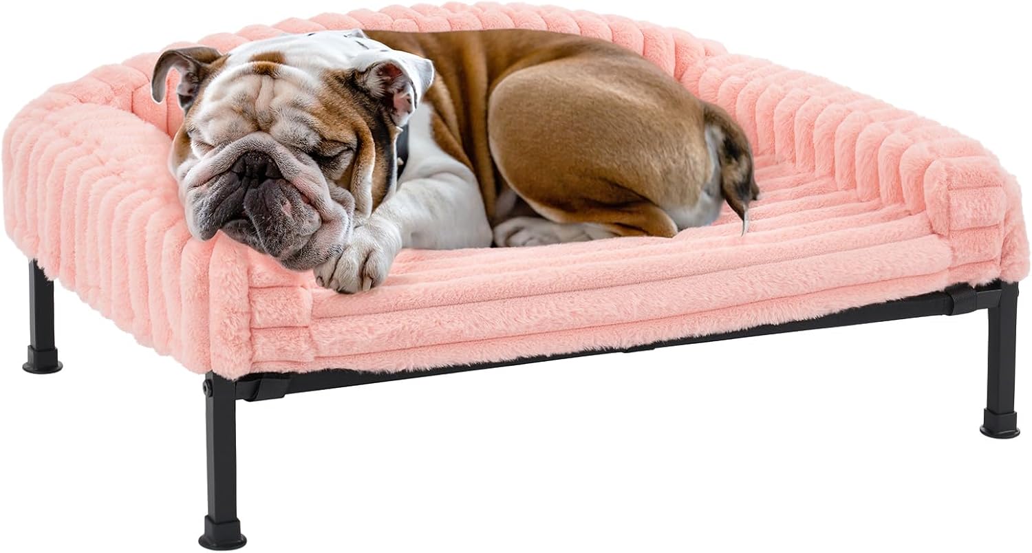 Veehoo Elevated Dog Bed with Bolster Cushion, Fluffy Plush Dog Couch Beds for Small Dogs, Cats, Washable Raised Pet Cot with Non-Slip Feet for Indoor or Patios Use, 36 x 28 Inches, Pink