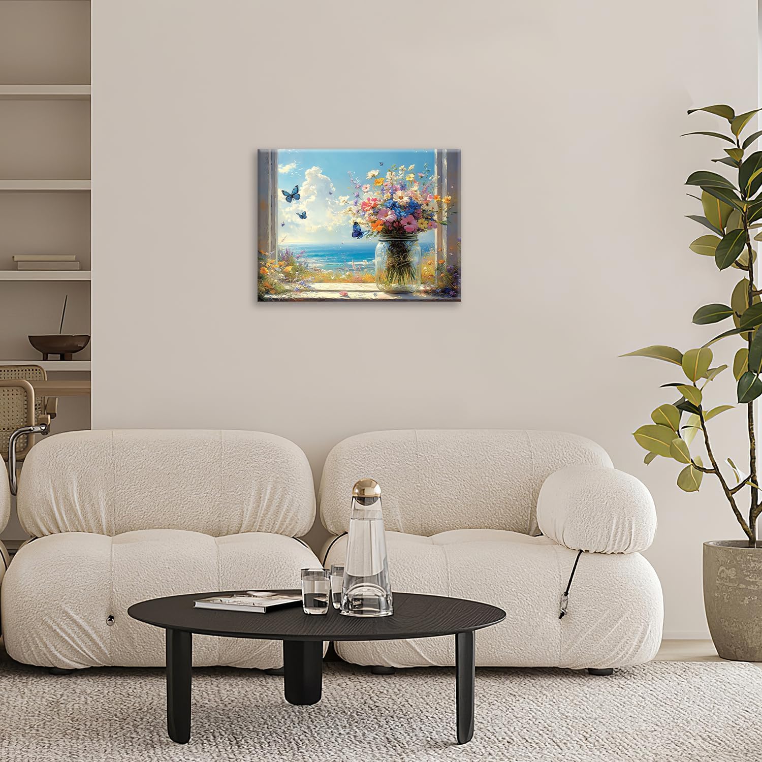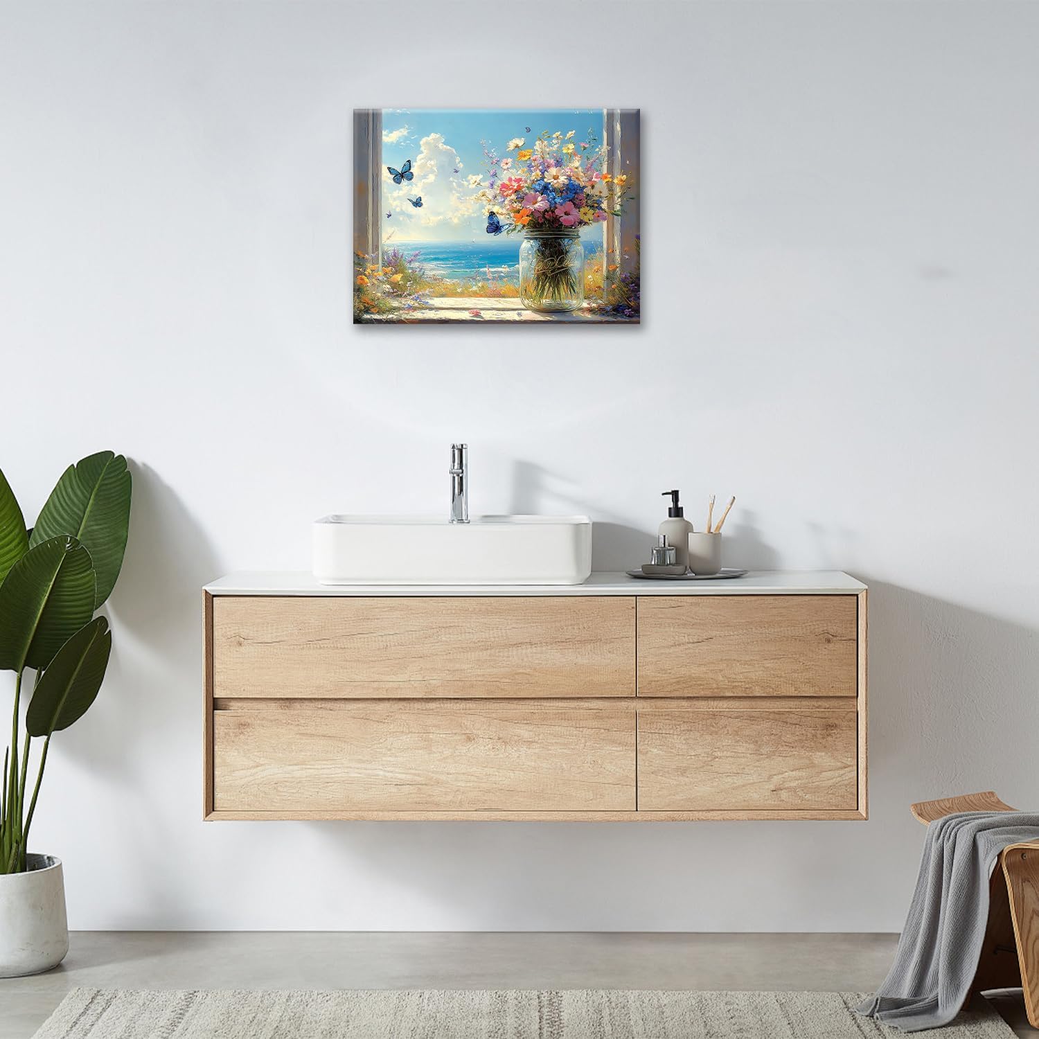 Beach Floral Bathroom Pictures Wall Art, Colorful Flower Bathroom Wall Decor, Coastal Ocean Framed Painting Canvas Artwork for Bedroom Living Room Decorations 20"L x 16"W