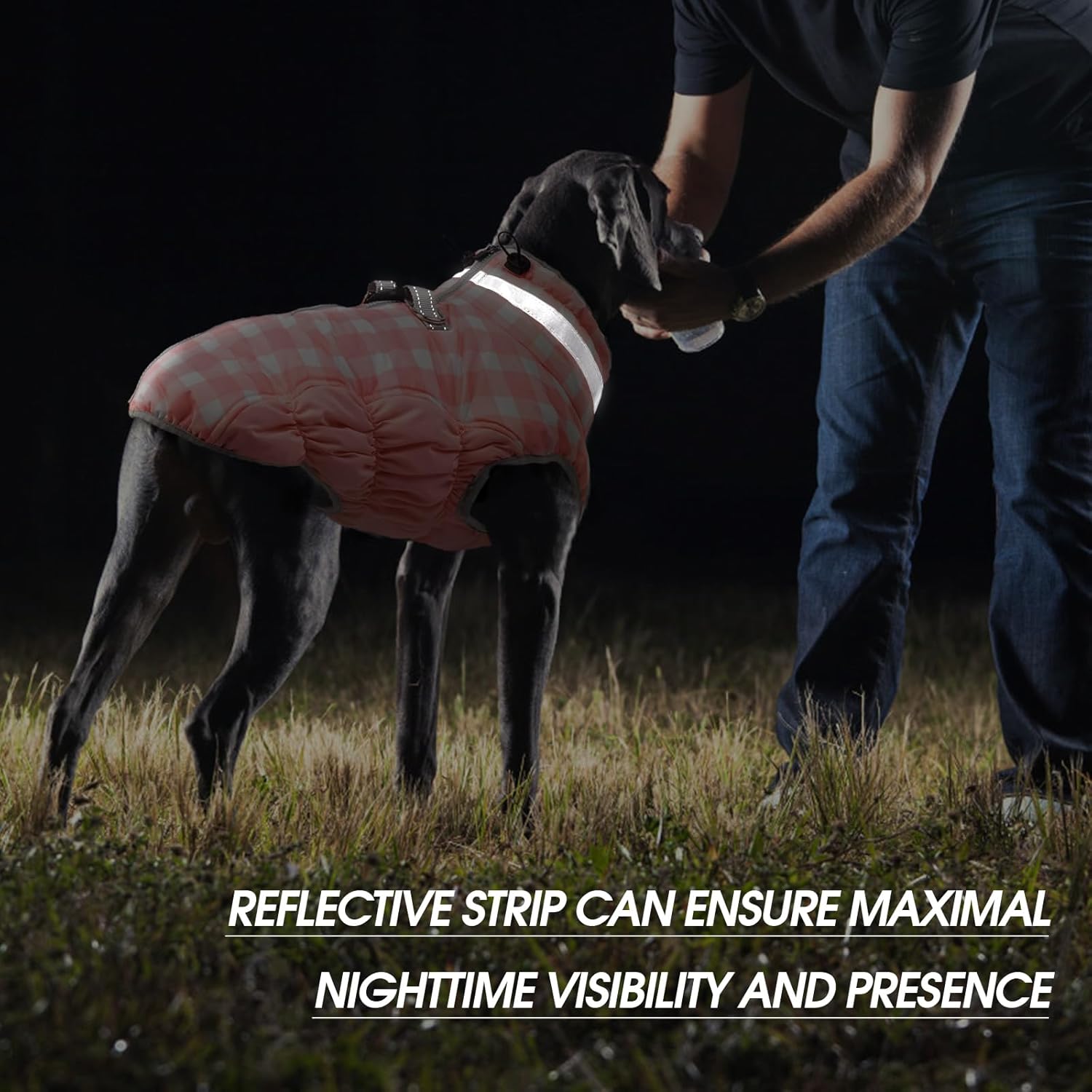 FUAMEY Dog Coat for Large Dogs,Waterproof Dog Winter Jacket with Harness Built in Puppy Cold Weather Coats Reflective Pet Vest with Zipper Warm Fleece Dogs Snowsuit Windproof Pink Plaid XL