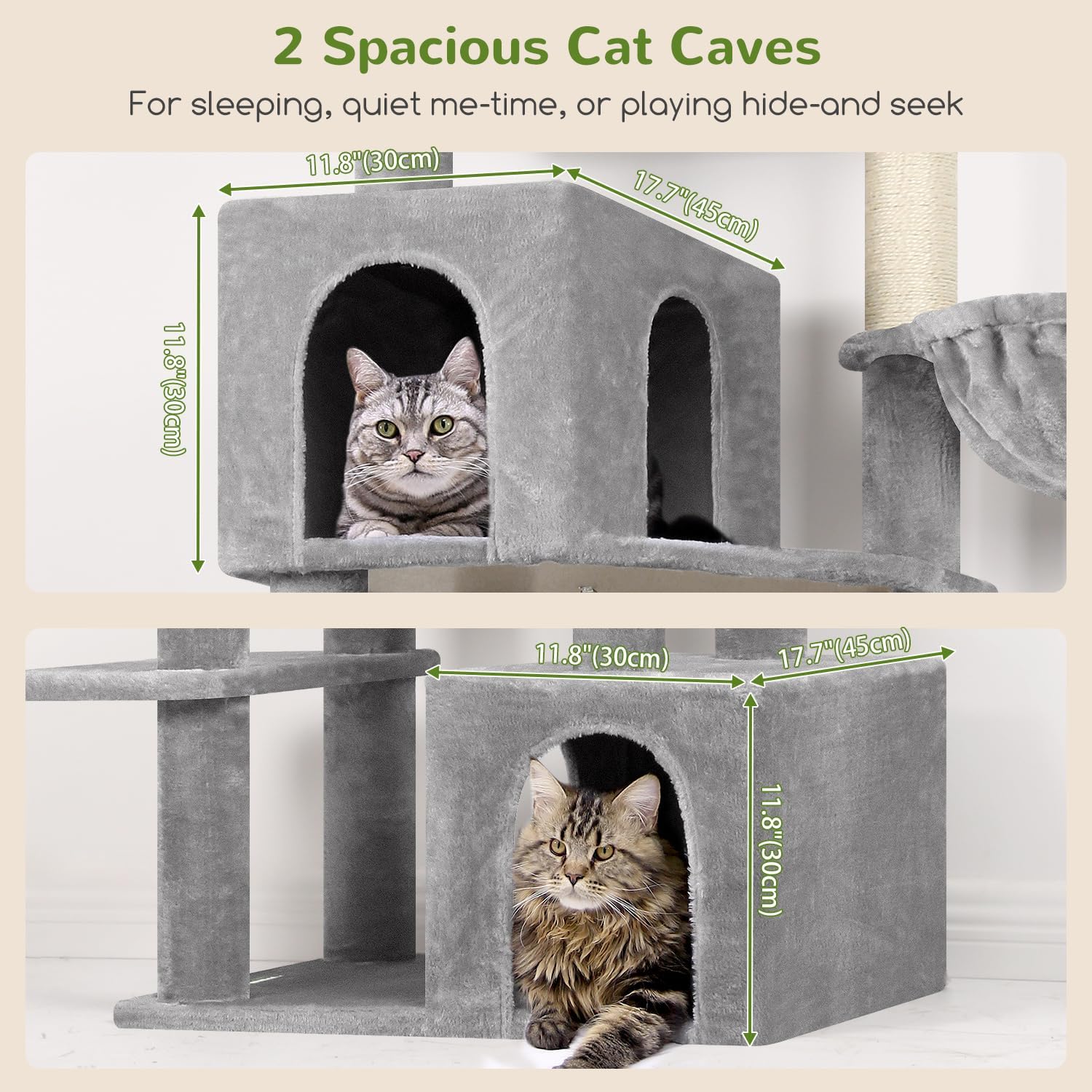 - 2 Spacious Cat Condos: This tall cat tree for indoor cats features 2 roomy cat condos, providing your cats with their own private space. Whether resting or playing, they can find a sense of security here and enjoy their own time