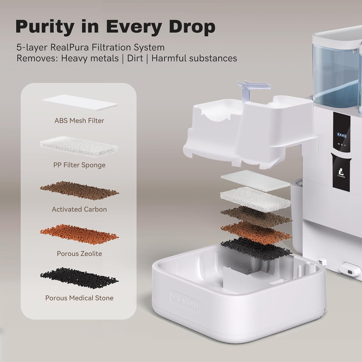 - Cleaner Water with the Unique 5-Stage Filtration: LALAHOME cat drinking fountain stands out with 5-stage filtration system: Water gets pre-filtered through a mesh screen, trapping hair and gunk in a sponge filter. Then itβs pushed through activated carbon, zeolite, and finally cleaned by the maifan stone. It can effectively filter and diminish the hair, impurity, odor, and chlorine. The filtered water dispenser can give cleaner water to pets and reduce the risk of developing illness.