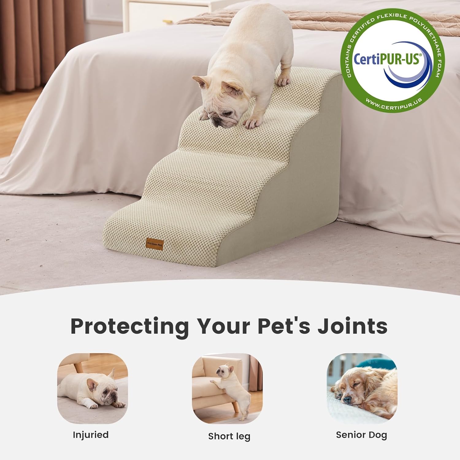 - No Assembly Required: The foam dog stairs for bed is convenient and hassle-free, simply unbox the pet steps, your furry friend can start using it right away. Due to vacuum compression, the surface of the puppy stairs may appear slightly wrinkled, and it will recover within 24-48 hours.