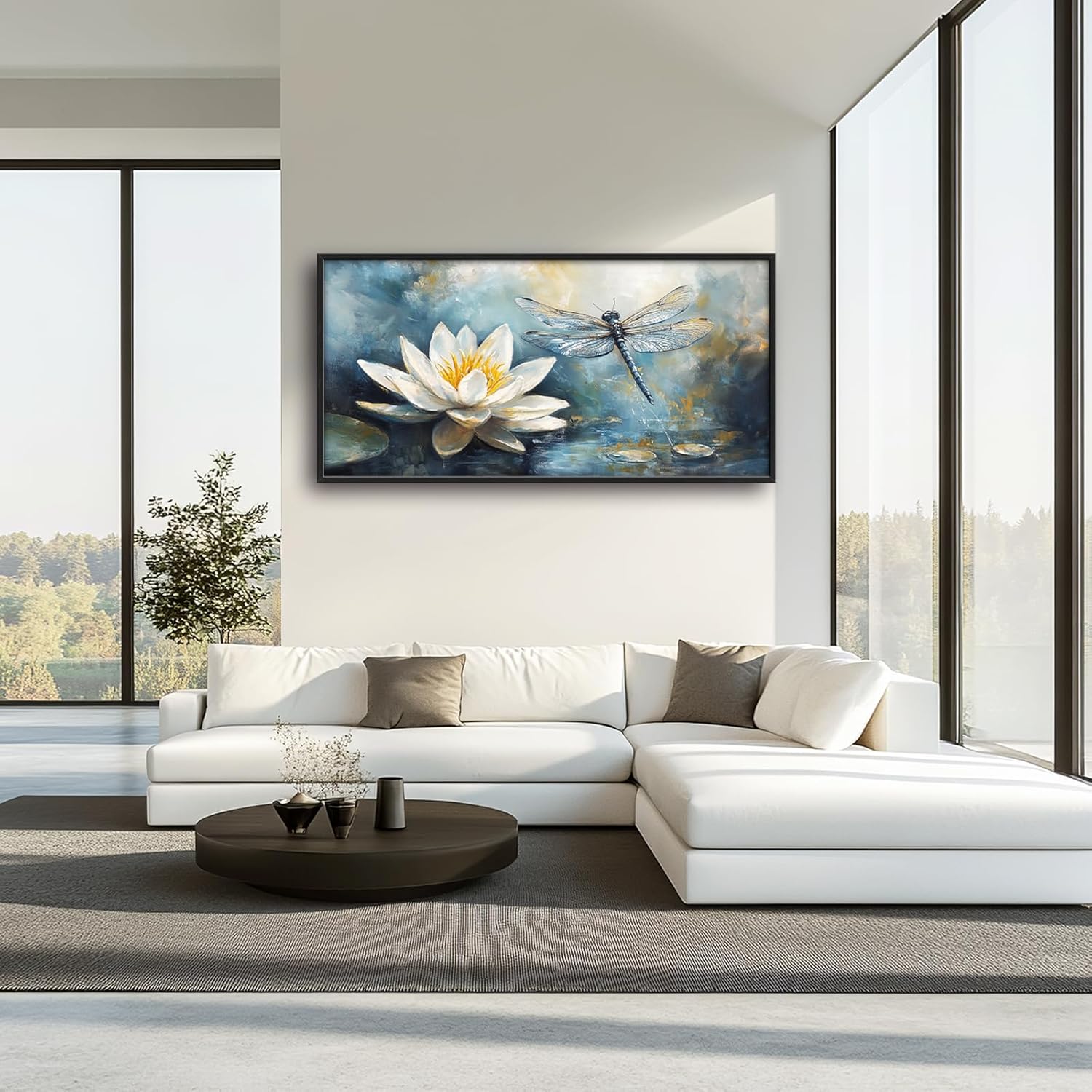Extra Large Lotus Dragonfly Framed Wall Art for Living Room,Abstract Blue Lotus Flower Lake Pictures Wall Decor,Nature Canvas Print Painting Modern Artwork Bedroom Office Bathroom 60L" x 30W"