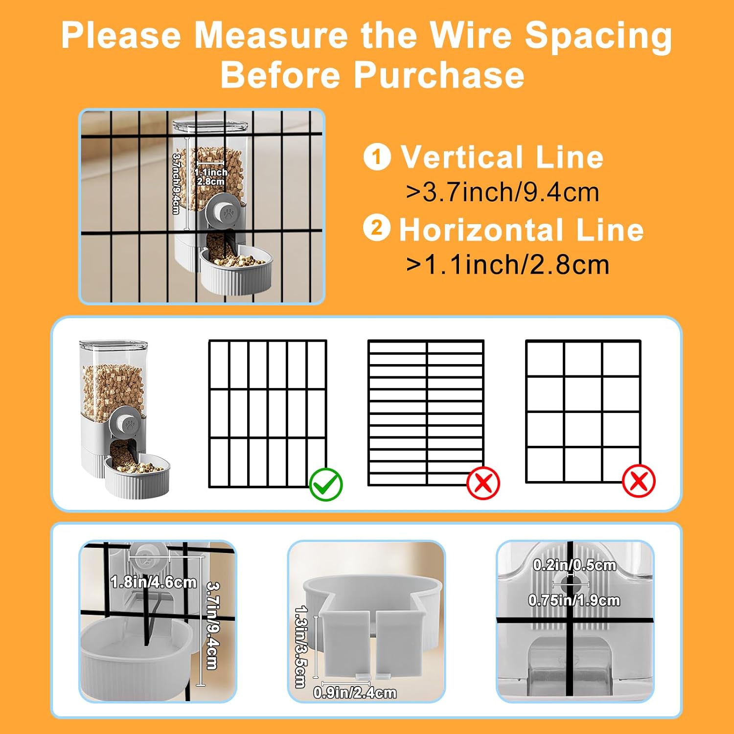 - Cage Pet Dispenser: It suits for small animals, as Cats, Dogs, Rabbit, Ferret, Chinchilla, Bird, Hedgehog, Guinea Pig and so on. Suggestions: the recommended spacing of cage wire mesh is 3-6cm (1.2-2.4inch), please measure your cage spacing before purchase.