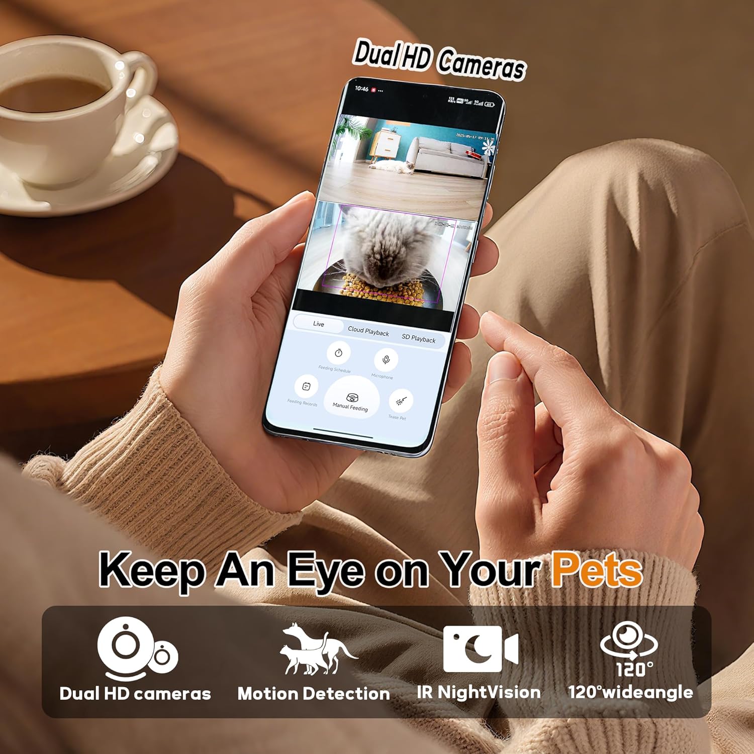 - 1080P HD DUAL CAMERA: The camera at the bottom is used to detect the pet's eating situation. The PTZ camera supports 120Β° left and right, 60Β° up and down ultra-wide-angle tracking and pet detection and tracking. It can take into account the pet's eating and record the pet's activities at the same time and send you notifications through the app; Automatic dog feeder supports intelligent smart night vision and does not affect pets' eating in night; Cloud storage video can be uploaded to the cloud (optional subscription) and supports multiple people to view online at the same time.