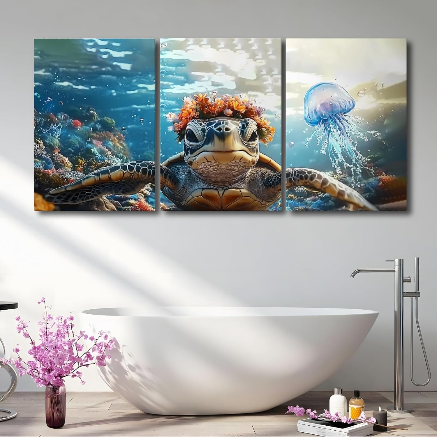 Wivsev Sea Turtle Canvas Wall Art,Under Sea Wall Art,Sea Life Pictures Wall Decor,Ocean Animal Painting for Bathroom,Living Room,Bedroom (24" x 36" x 3 pcs)
