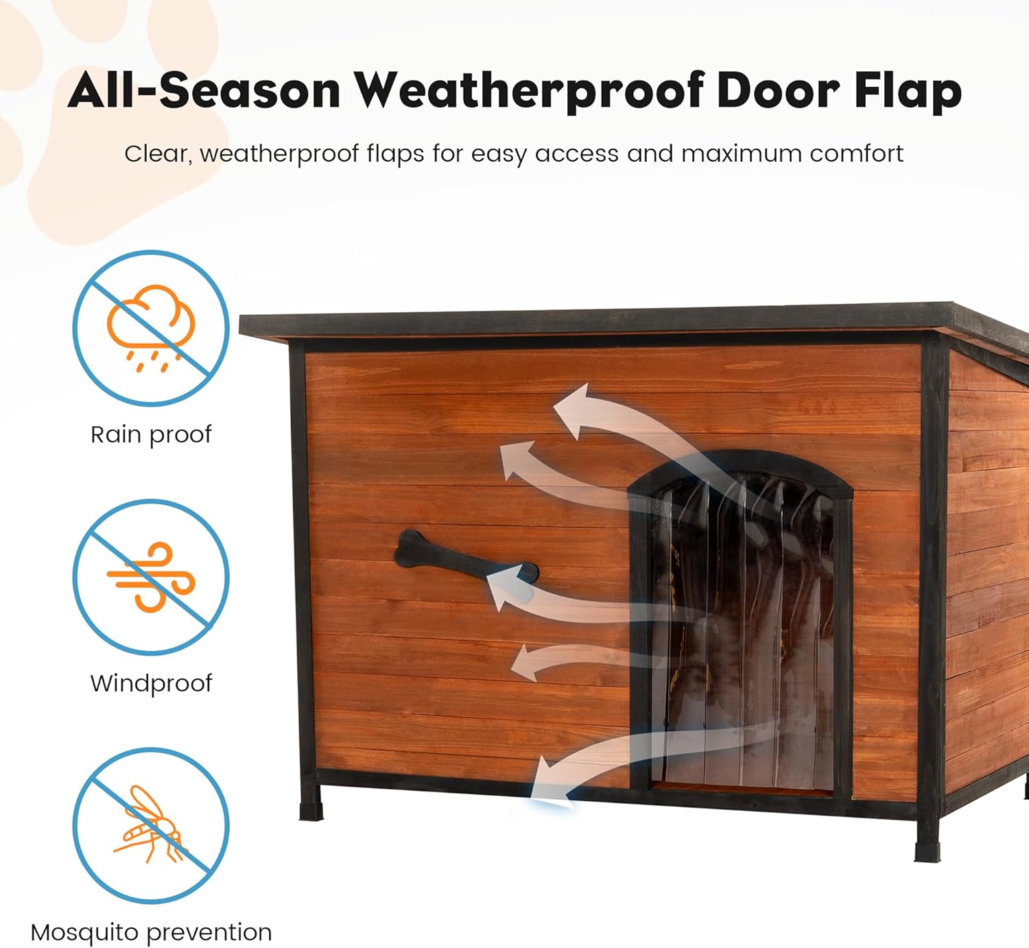 - [Specially Designed for Outdoor Use] The sloping asphalt roof is expertly engineered to prevent rainwater from pooling, ensuring that your pet's living space remains dry and comfortable. The floor is 2.4ββ above the ground, and there is a removable PVC curtain and adaptable floor pads for uneven ground. This design enables the dog house to withstand harsh weather conditions, preventing water from seeping in and materials from getting damp
