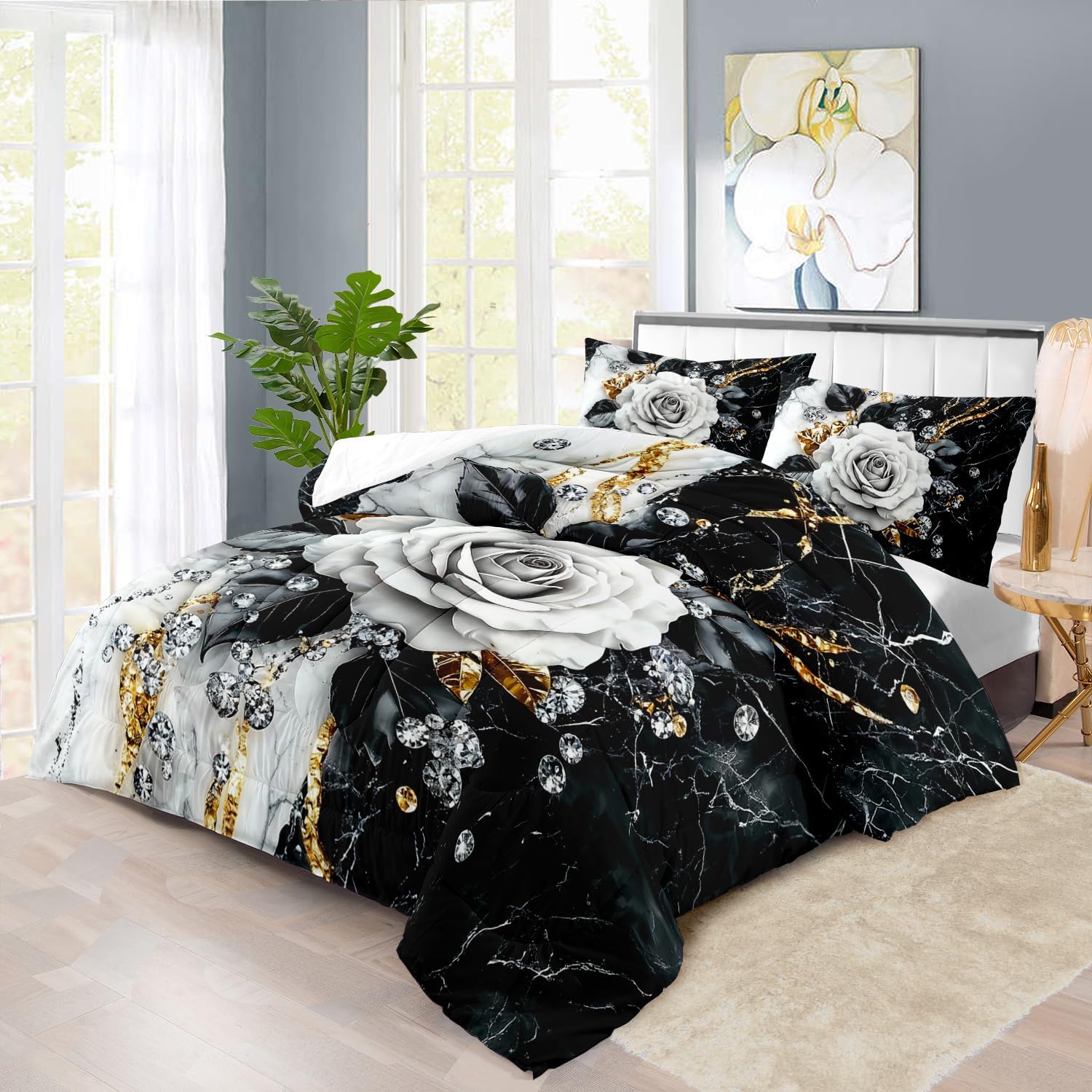 Marble Floral Comforter Set for Queen Bed Women,Vintage Flower Bedding Set Queen,White and Black Comforter Rose Quilt for Girls,Rose Bedding Floral Bedroom Decor Adults