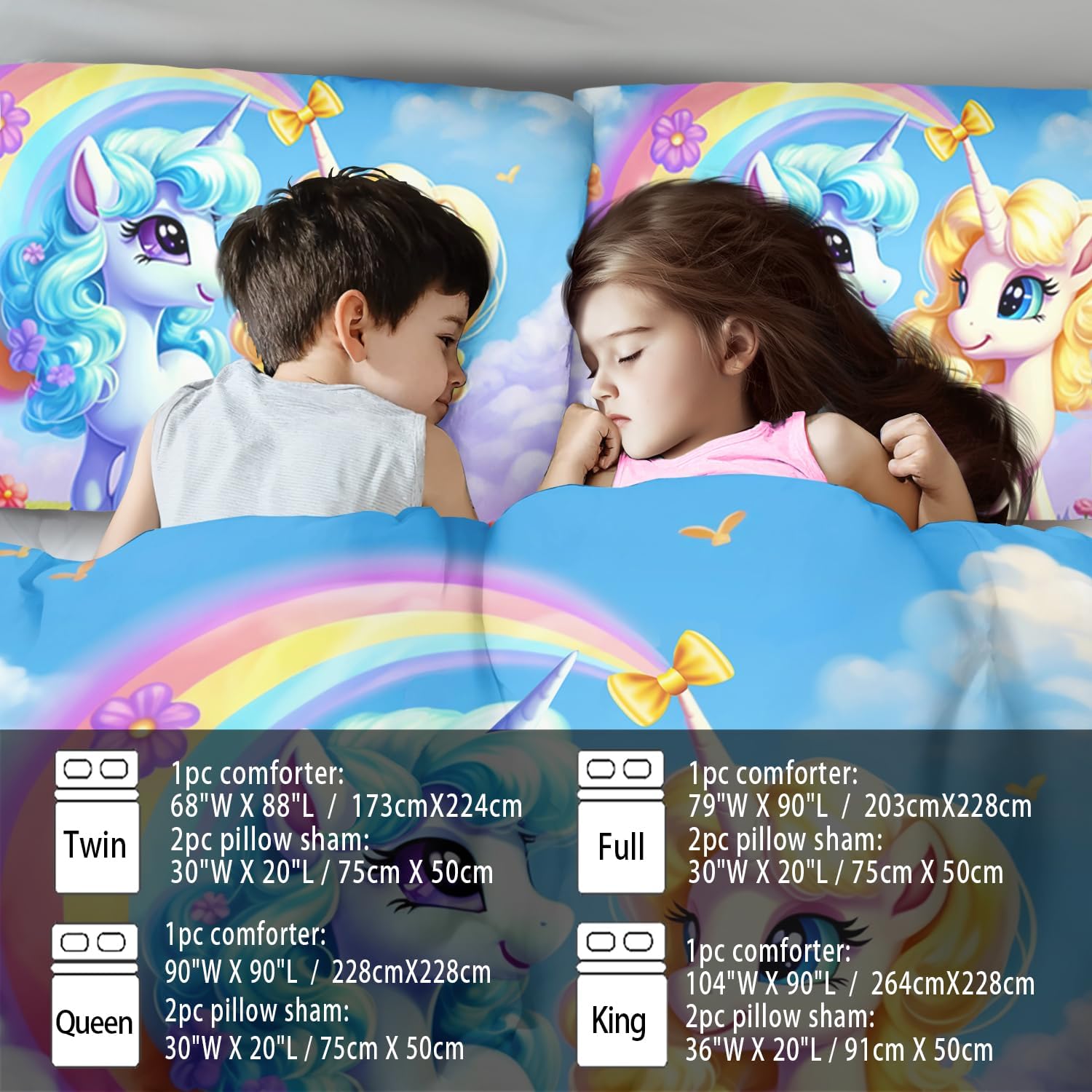 - Queen Size Rainbow Unicorn Comforter Set :This bedding set includes 1 comforter(67" x 85") and 2 pillowcases(20”x30”). In order to facilitate transportation, the quilt is made of vacuum compression technology. It will be slightly wrinkled when taken apart, but it will quickly regain its fluffiness if you gently beat it.