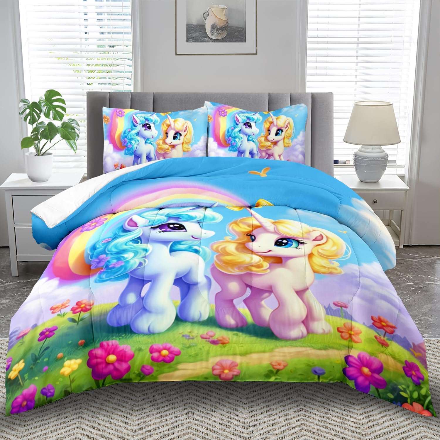 Unicorn Comforter Set Queen,Kawaii Unicorn Bedding Set Queen Kids,Rainbow Comforter Blue Bedroom Decor,Cute Animal Bedding Rainbow Bed Decor for Girls,Cartoon Blue Floral Quilt