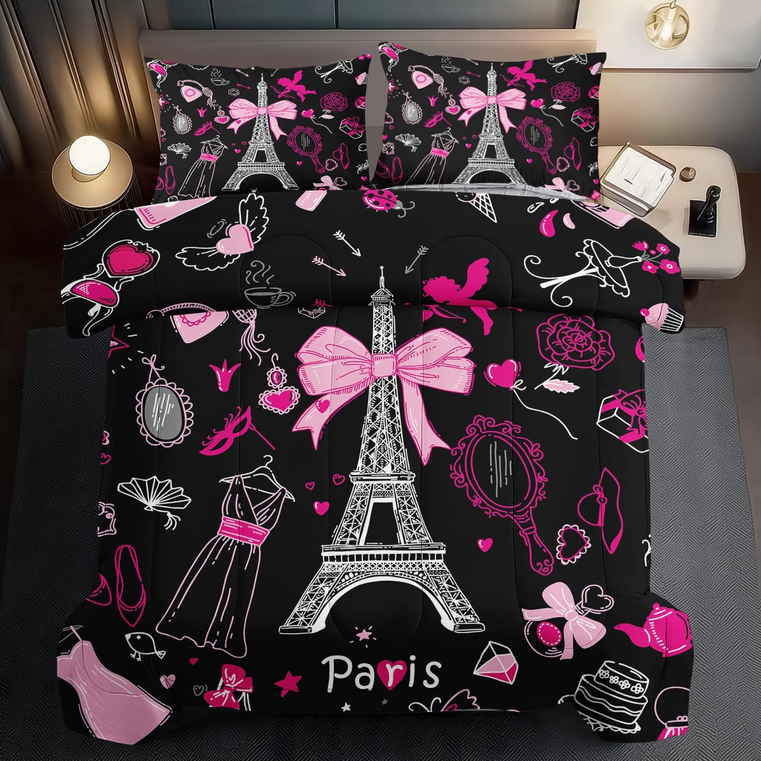 Eiffel Tower Comforter Set Twin Size,Eiffel Tower Bedding Set for Girls, Pink and Black Paris Themed Comforter Bedroom Decor,Paris Quilt French Style Romantic Bedding