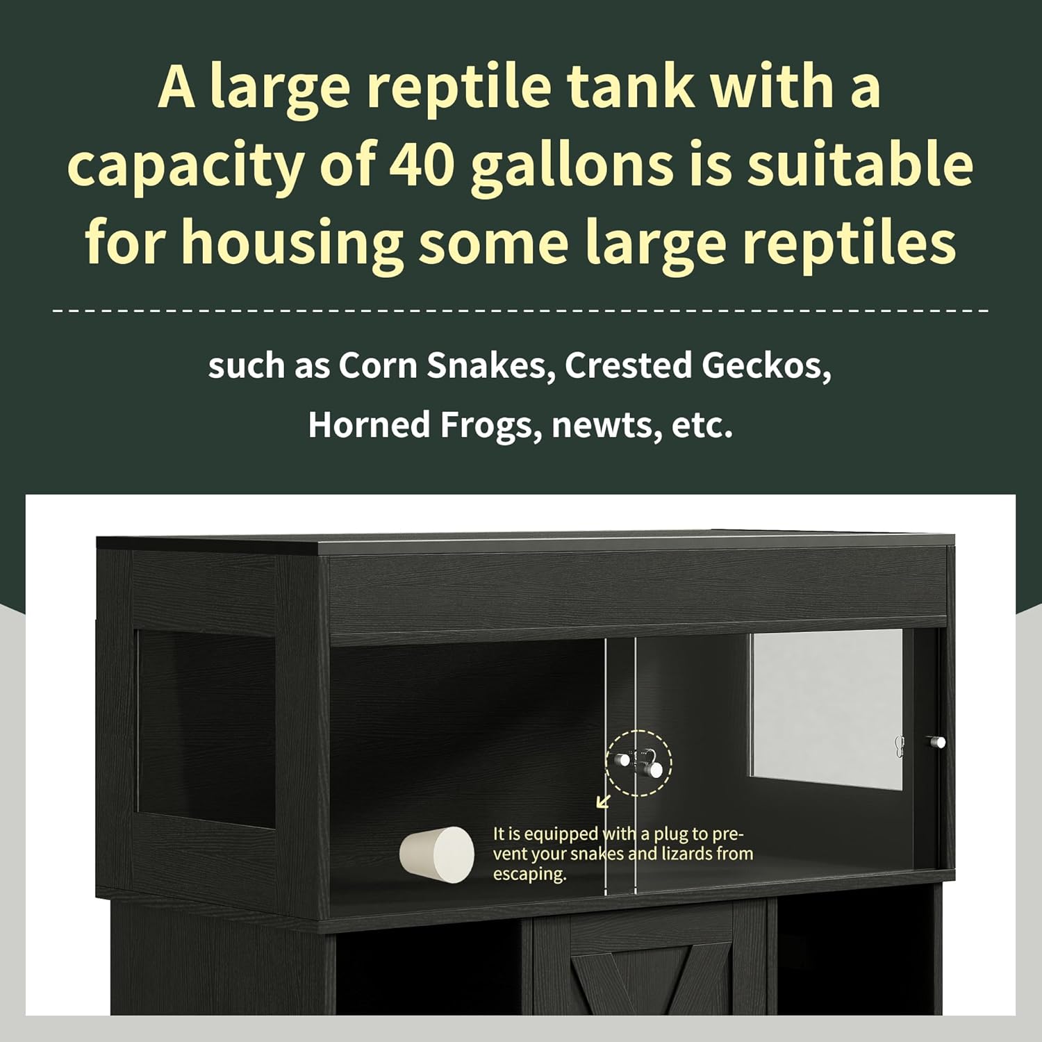 - All-in-One Storage Base β More than just a vivarium tank, this design includes a full base cabinet with dual side compartments and a center door cabinet. Easily store all your reptile care essentialsβUVB lamps, heating mats, thermometers, substrate, snacks, and toolsβin one organized space.