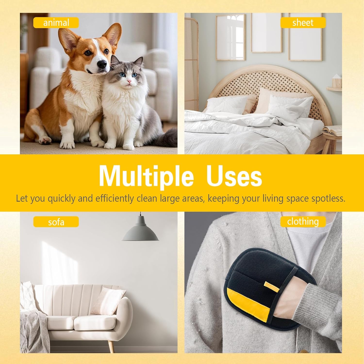 - 【Versatile Cleaning Champion - Pet Hair Remover Gloves for Every Surface】 The ultimate multi-purpose pet hair remover! This pet hair removal gloves works wonders directly on your cats and dogs, and tackles embedded hair on clothing, upholstery (sofas, car seats), carpets, bedding (sheets, quilts), and more. One electrostatic pet hair removal gloves conquers fur everywhere.