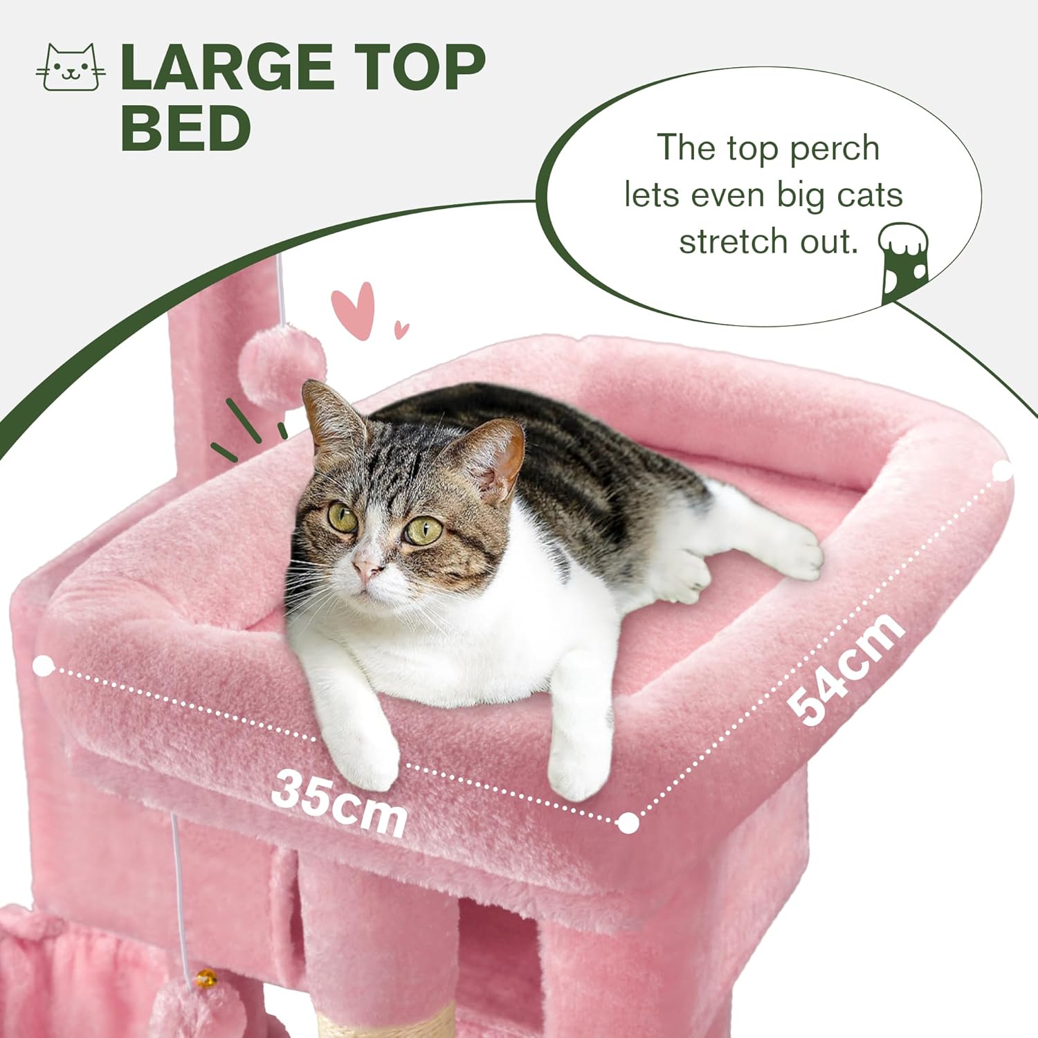 - Large-Top Perch: This Deluxe Cat Tree features an oversized perch that provides plenty of room for big cats to fully stretch out and relax, and the thick and wrapped platform provides strong support when cats rest their furry heads on top