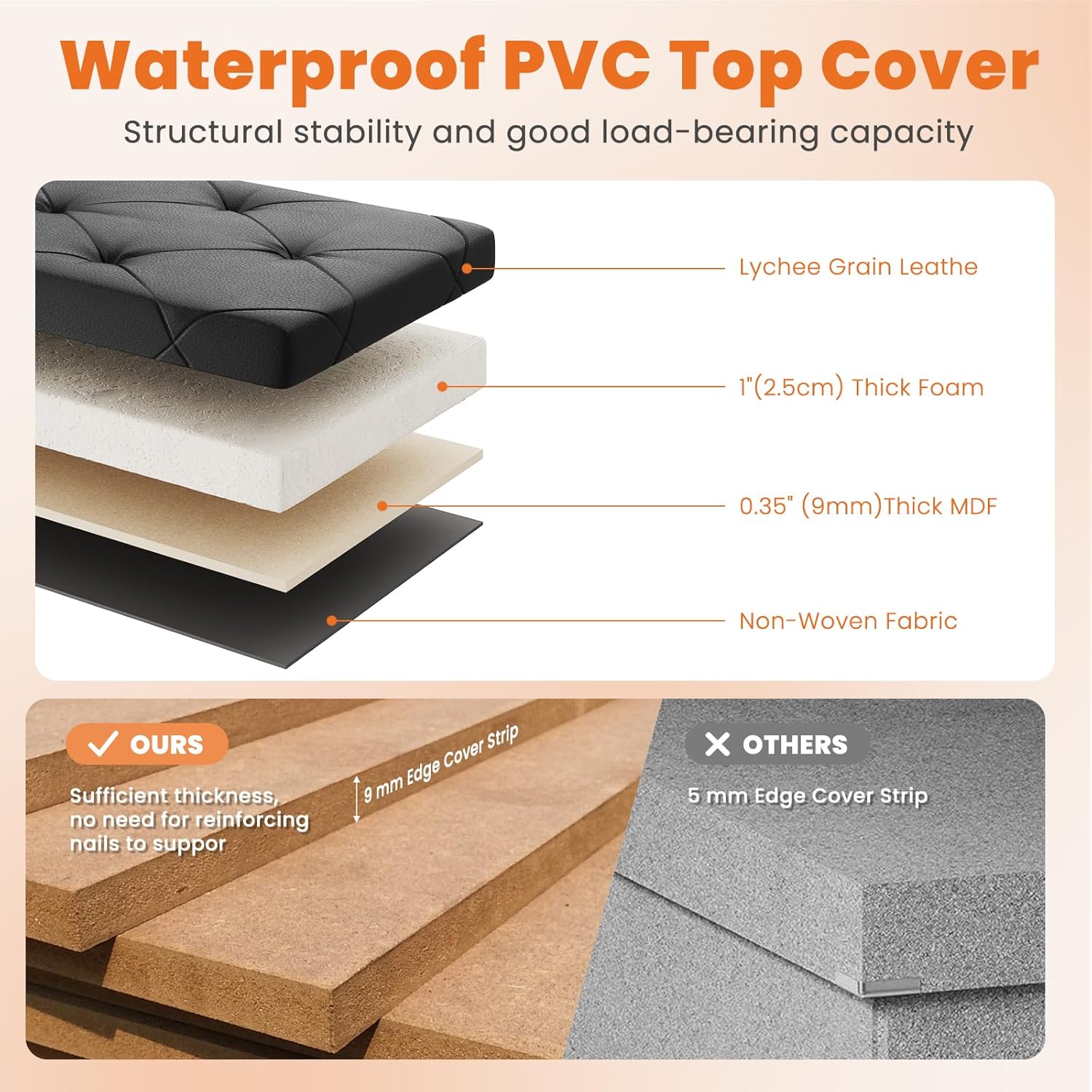 - γPremium & Durable BuildγThe black Sweetcrispy storage ottoman features chic Lychee Grain Leather, while brown uses sleek Synthetic Leatherβboth super comfy and built to last. No flimsy stuff here! We use 4 layers of reinforced material with 9mm-thick edges, supporting up to 660 lbs without extra nails. Just sturdy Sweetcrispy quality!